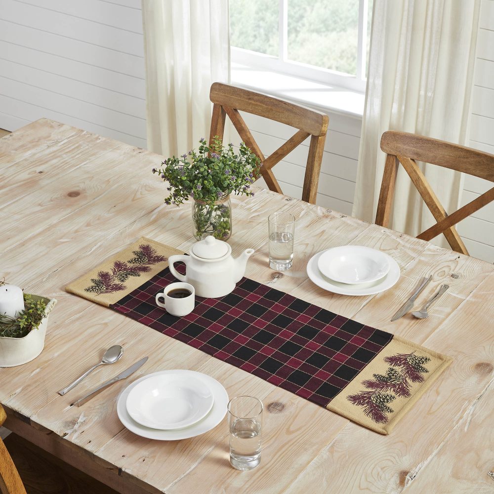 Elevate your autumn and winter gatherings with the Connell Pinecone Runner, a heartwarming touch for any farmhouse or cottage core haven. This inviting 12 by 36 inch table runner weaves a tale of cozy elegance, featuring traditional deep-toned plaid in rich burgundy and timeless black. Flanking this classic pattern, warm tan blocks unfold, showcasing a primitive yet charming pinecone and pine needle design, bringing the serene beauty of the natural world right to your tabletop. Crafted from 100 percent woven cotton, its soft texture and durable construction promise both comfort and lasting charm. Perfect for infusing your dining space with a rustic, seasonal glow, this dark fall runner is easily cared for with machine wash and low tumble dry. Curate a truly cohesive and timeless country look by pairing it with other cherished pieces from the exclusive Connell Collection by VHC, transforming your home into a welcoming sanctuary.