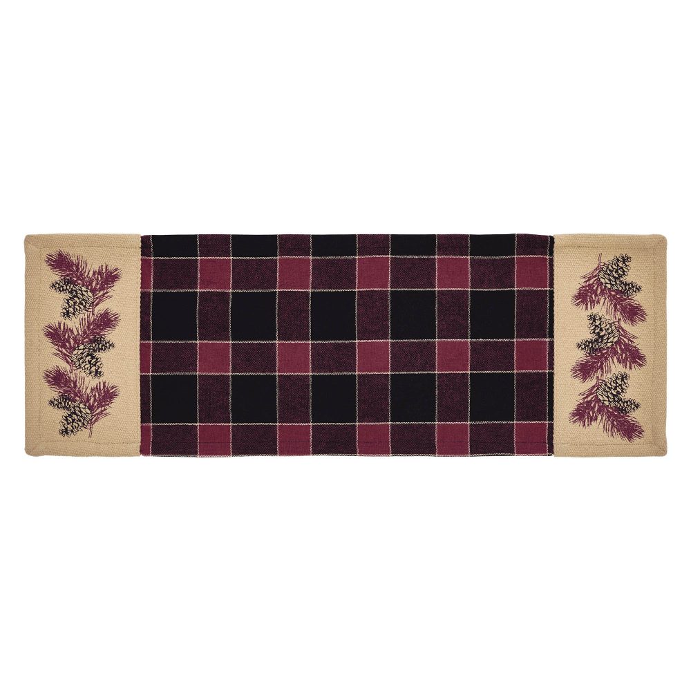 - RUSTIC WOODLAND ELEGANCE: Elevate your dining experience with this 8×24 inch Lodge Cabin Woodland table runner, showcasing a timeless design of primitive pinecones and delicate pine needles on natural tan blocks, beautifully framed by a classic burgundy and black plaid backdrop, expertly crafted from 100% finely woven cotton for a comforting feel and lasting durability, ensuring effortless maintenance with machine washable and tumble dry low care, and perfectly complementing other cherished items from the VHC Brands Connell Collection.