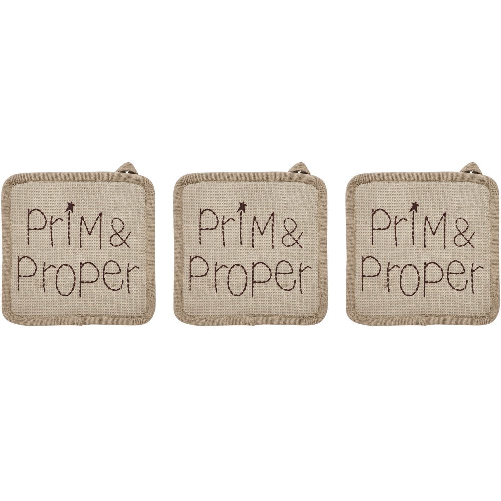 - Primitive Elegance: The VHC Brands Cotton Prim & Proper Pot Holder Set of 3 from the Connell Collection exudes primitive elegance, making it a charming addition to your kitchen.