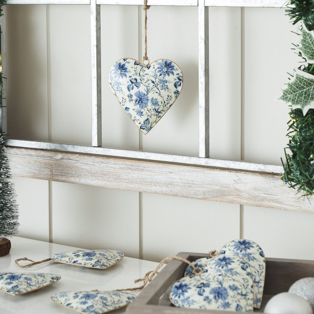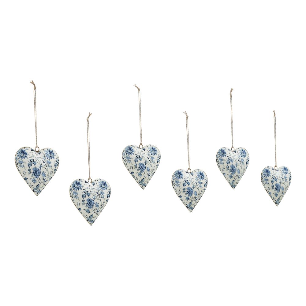 Bring elegance and softness to your holiday decor with the VHC Brands Cottage Floral Metal Ornament Set of 6. Crafted from durable iron, each ornament features a white heart-shaped base beautifully printed with floral and leaf designs in shades of light blue. A bright gold trim adds a subtle touch of sparkle, while the included twine hanger enhances its primitive, handcrafted appeal. These ornaments offer a delicate blend of cottage-inspired charm and festive detail, making them ideal for Christmas trees, garlands, or tabletop arrangements. The calming color palette and vintage floral design provide a refreshing alternative to traditional holiday motifs, perfect for those who favor a rustic or romantic seasonal aesthetic. Perfect for use in the bathroom, bedroom, dining room, entryway, kitchen, or living room, this set of six heart ornaments adds a gentle, graceful accent to any space. Whether grouped together or styled individually, the Cottage Floral ornaments bring timeless beauty and warmth to your winter decor. For best care, simply wipe clean with a soft cloth.