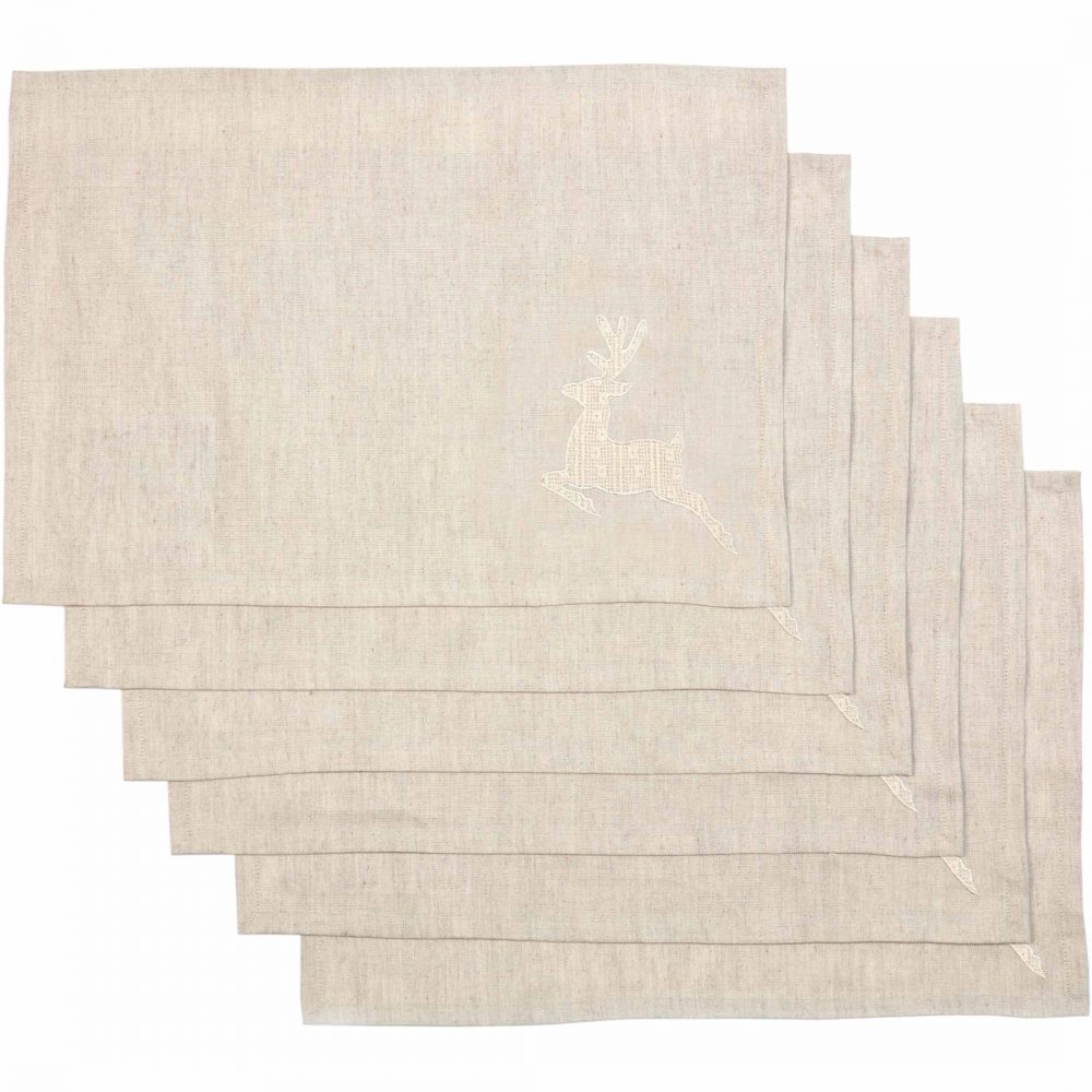 - QUALITY MATERIAL: Our Creme Lace Deer Holiday Placemat Set is uniquely crafted in a cotton/linen blend for a stylish yet durable accent in your elegant farmhouse kitchen.