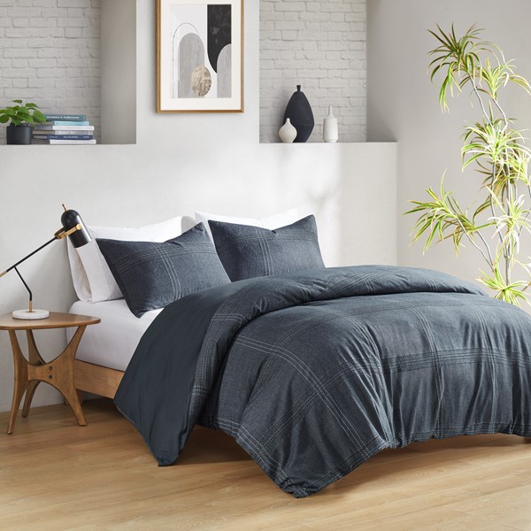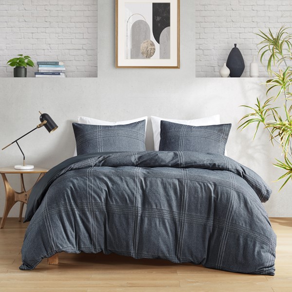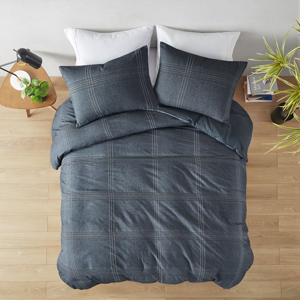 Anders utilizes a waffle weave technique to create an oversized, airy plaid design. It is inspired by industrial architecture and taps right into the most updated trends. With the garment-wash technique, the dark charcoal coloration creates a highly dramatic contrast and enhances the texture of the pattern.