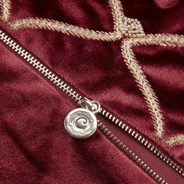 100% polyester velvet embrodiery and hand beaded, with 1/4" corded piping, metal zipper with logo puller. 100% WG feather insert with 233TC cotton down proof cover