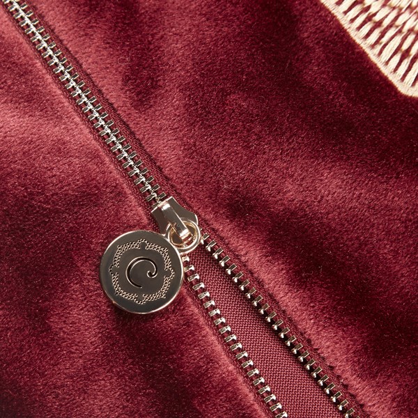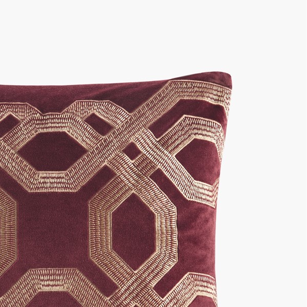 100% polyester velvet embroidery, with 1/4" corded piping, metal zipper with logo puller. 100% WG feather insert with 233TC cotton down proof cover