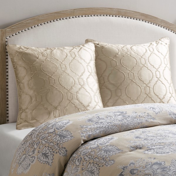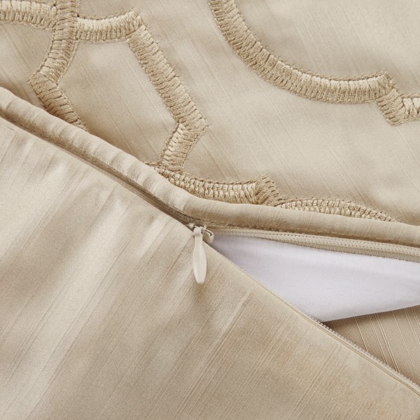 This embroidered ogee pattern inspired by 16th century Turkish textiles creates a pleasing flow and rhythm on the top of the Montague collection. The high-quality antique satin reflects a brilliant infusion with these signature gentle curves, bringing a classic and luxe look to your bedroom.