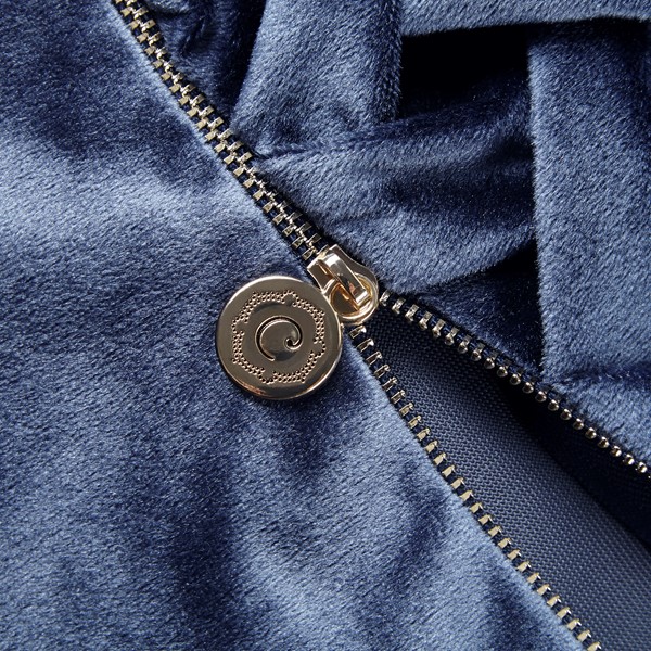 100% polyester velvet hand pintucked, metal zipper with logo puller. 100% WG feather insert with 233TC cotton down proof cover