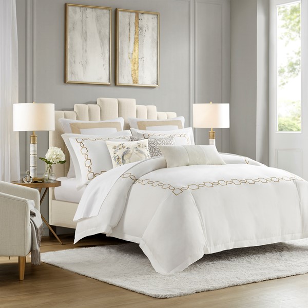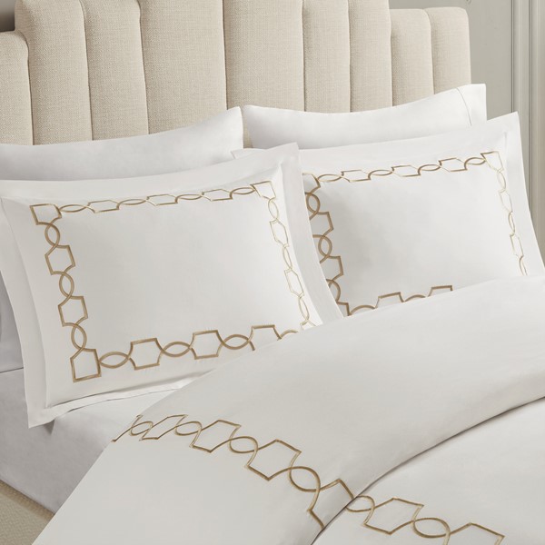 The base fabric is a blend of cotton and rayon from bamboo, which is incredibly soft to the touch and comforting. The embroidered frame pattern features a high-density embroidery stitch that embellishes the bedding, while at the same time keeping the design simple, relatable, and perfect for everyday use.