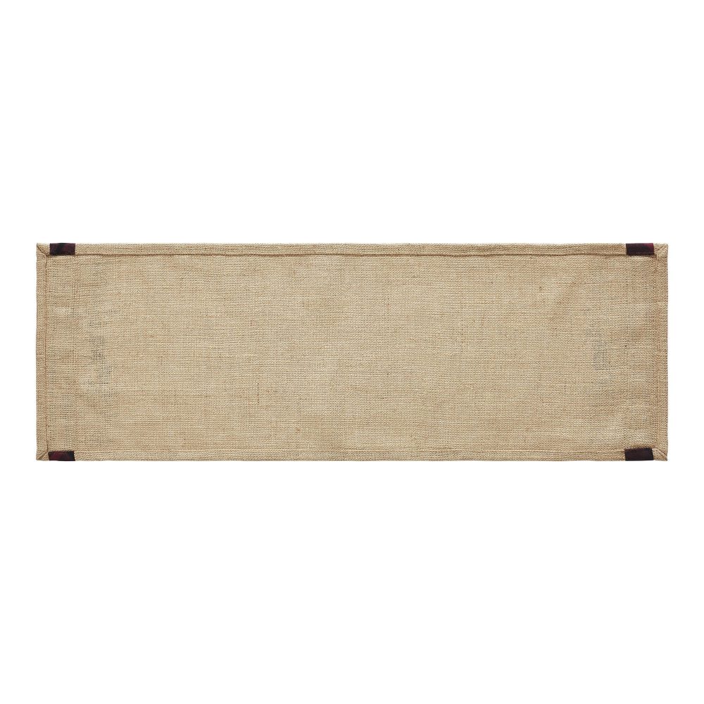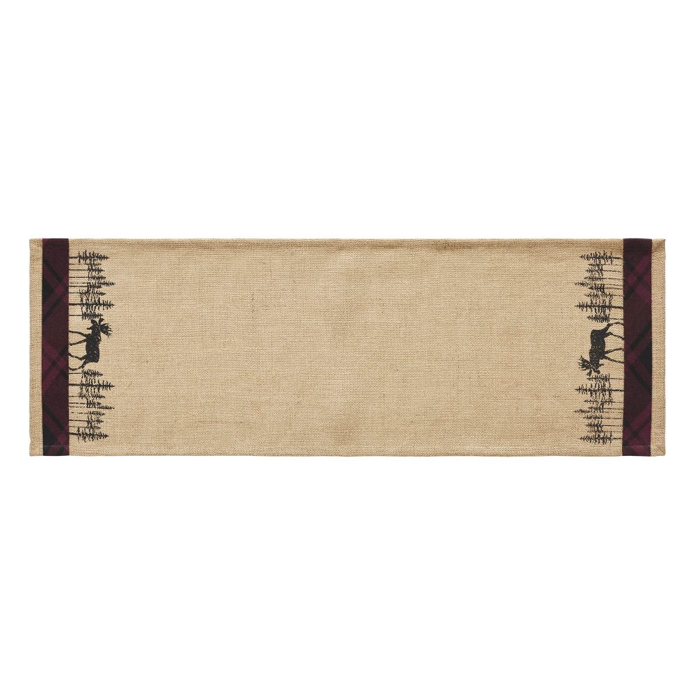 Add a warm, rustic feel to your table for a cozy winter tabletop. The Cumberland Moose Table Runner includes one 12x36 runner. The tan burlap base adds a textured appearance that is enhanced by applique fabric stripes in black and red plaid. The applique striping frames a mirrored stenciled design featuring black pine trees and a weathered moose silhouette. Coordinates with the Cumberland Collection by VHC for rustic country style for your whole home.