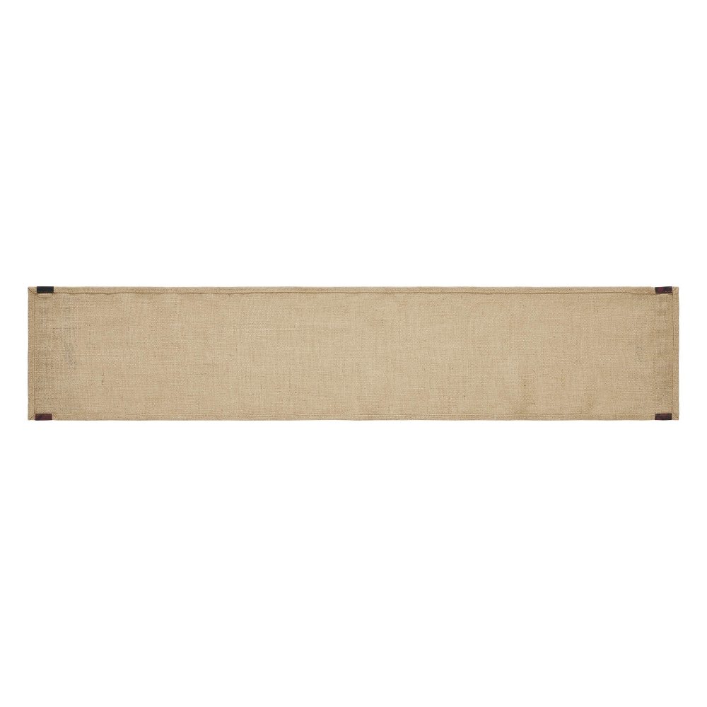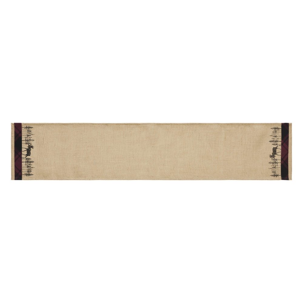 Add a warm, rustic feel to your table for a cozy winter tabletop. The Cumberland Moose Table Runner includes one 12x60 runner. The tan burlap base adds a textured appearance that is enhanced by applique fabric stripes in black and red plaid. The applique striping frames a mirrored stenciled design featuring black pine trees and a weathered moose silhouette. Coordinates with the Cumberland Collection by VHC for rustic country style for your whole home.