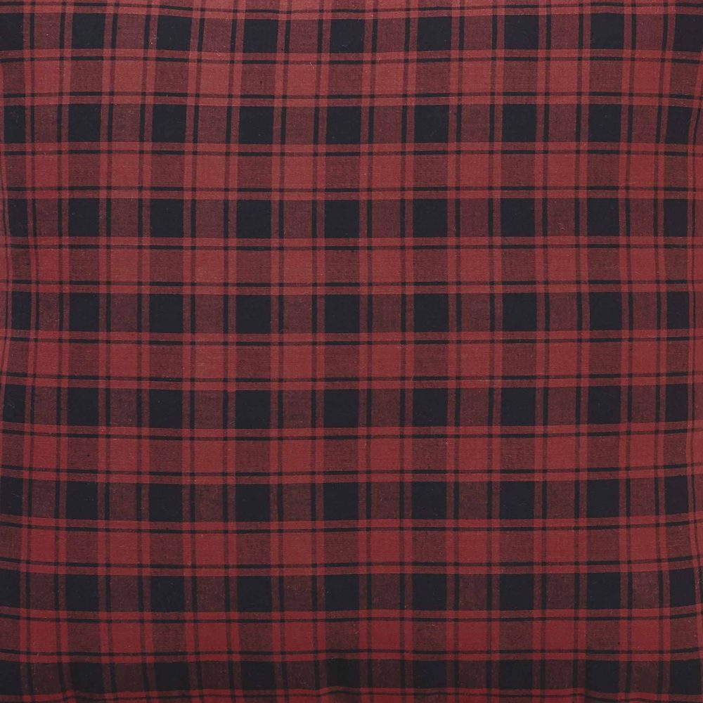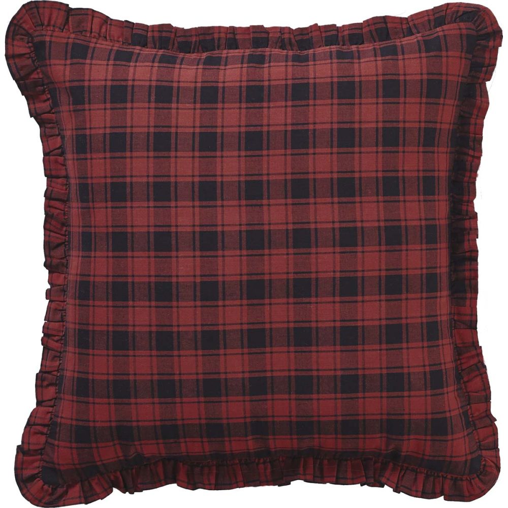 Bring a little bit of the wilderness inside with a rustic design and bold, adventurous tones of chili pepper red and caviar black in a traditional buffalo plaid pattern. The Cumberland Plaid Pillow measures 18x18 inches and features a solid red and black plaid throughout with a deeply ruffled edging to soften the look. Reverses to matching plaid with tie-style closures for easy cleaning. The throw pillow coordinates with the Cumberland Collection by VHC for rustic country style throughout your whole home.