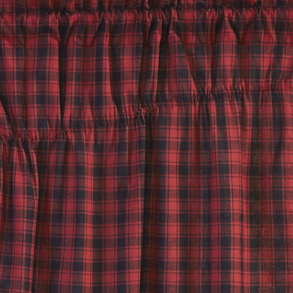 Decorate your windows with a touch of bold, rustic country style with this charmingly designed and thoughtfully crafted window panel set. Displaying a timeless country look with a bold, cabin-inspired buffalo plaid in chili pepper red and caviar black, the Cumberland Short Prairie Panel Set 63x36x18 enhances your home decor with a relaxed, cozy lodge feel. The gracefully angled drapes perfectly frame windows providing a bit of polish for your home. Our fully lined prairie panels come with built in drawstrings to adjust each panel to meet your style needs, along with a curtain rod pocket for easy hanging. Includes two matching panels for a perfectly dressed kitchen or living room window.