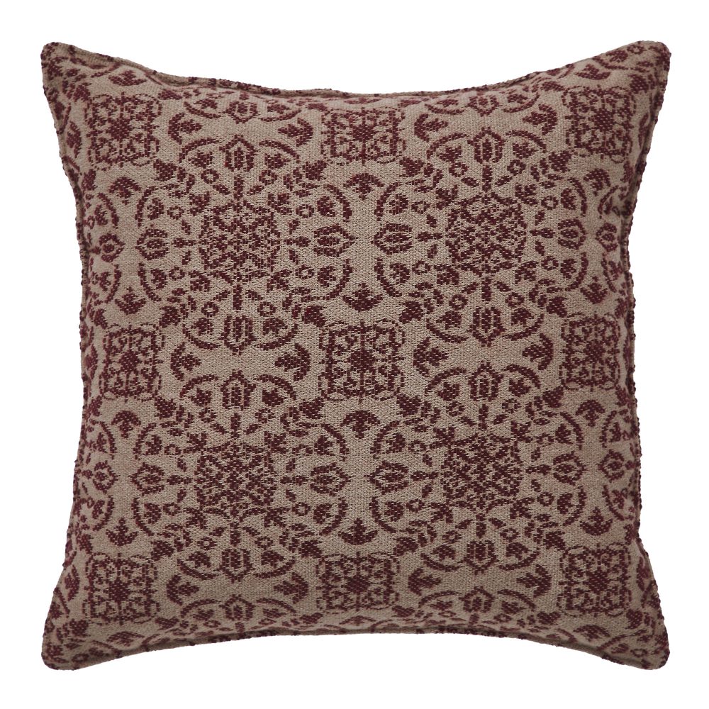 Elevate your primitive and country-inspired interior with the VHC Brands Custom House Burgundy & Tan Jacquard Pillow, a delightful addition to your decor. This square 9x9 pillow, part of the Custom House Collection, features a charming medallion design on a natural cotton cover filled with plush polyester. It's the perfect decorative throw pillow to enhance your couch, bed, or studio, offering both comfort and style with a textured finish that effortlessly complements a variety of interior aesthetics, from midcentury modern to classic primitive charm. Add a touch of timeless elegance to your home with this versatile 9x9 square pillow, whether used as an accent piece or for lumbar support. The VHC Brands Custom House Burgundy & Tan Jacquard Pillow exudes classic appeal, creating a cozy atmosphere in any room. With its neutral color palette and intricate medallion pattern, it seamlessly blends with a range of interior decor styles, making it the ideal choice for adding character to your living spaces and celebrating the enduring charm of primitive and country design. Upgrade your space with this exquisite pillow and enjoy the perfect blend of comfort and style, reflecting the rich heritage of rustic and vintage aesthetics. Decorate your space with a touch of tradition and style by incorporating the VHC Brands Custom House Burgundy & Tan Jacquard Pillow. With its combination of comfort, texture, and charming medallion design, this 9x9 pillow effortlessly complements any home's decor, from classic primitive to modern midcentury designs. Create a warm and inviting atmosphere with this elegant accent piece, whether you place it on your couch, bed, or in your studio. The neutral colors and intricate pattern ensure it seamlessly fits into your interior, adding character and timeless appeal to your living spaces.