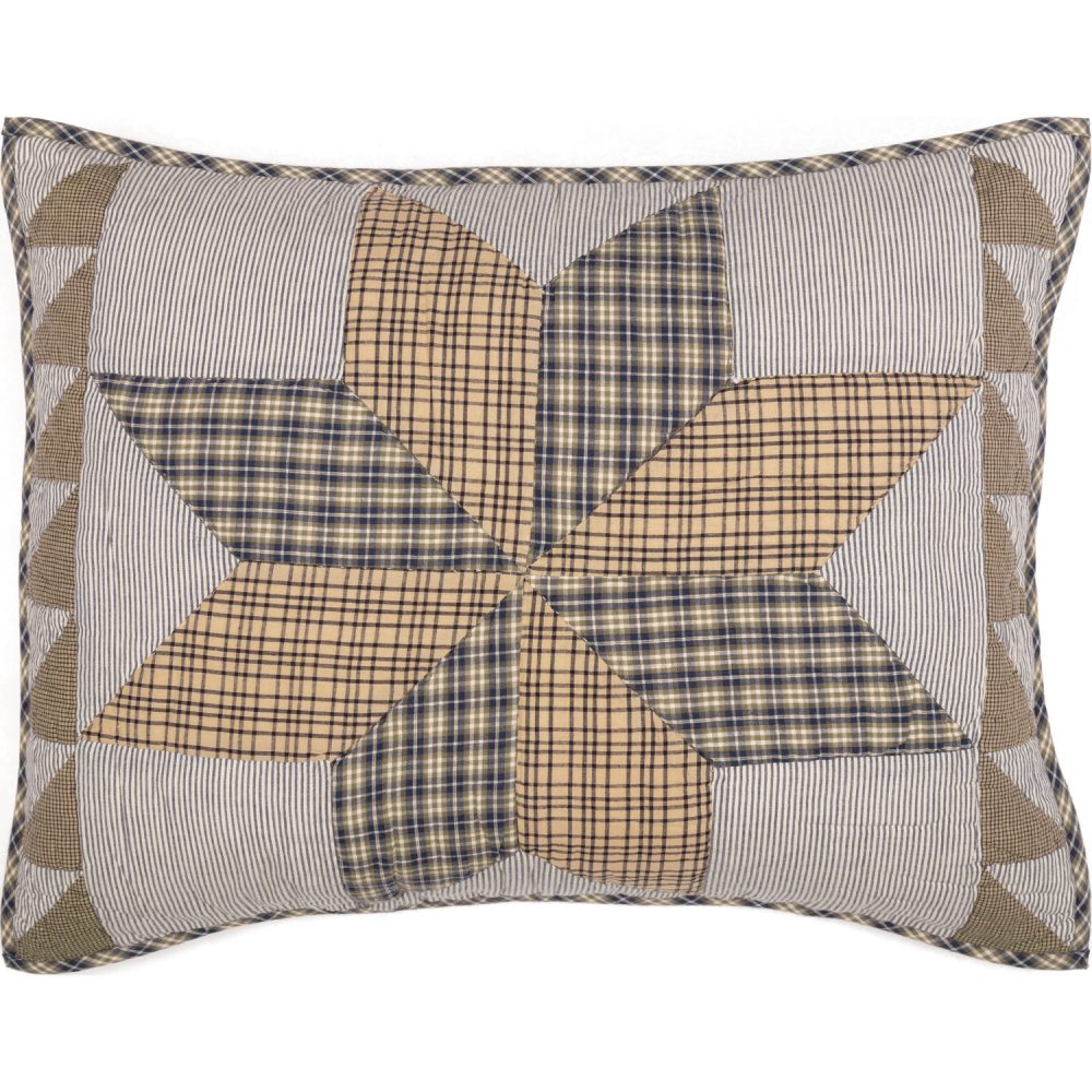 Adorn your bed with a classic farmhouse, vintage look. The Dakota Star Farmhouse Blue Standard Sham 21x27 features warm grey, washed blue, and vintage white patchwork with an 8-point star. The classic star adds a country, rustic look to the quality, 100% cotton Sham. Coordinates well with the Dakota Star Farmhouse Blue Quilt.