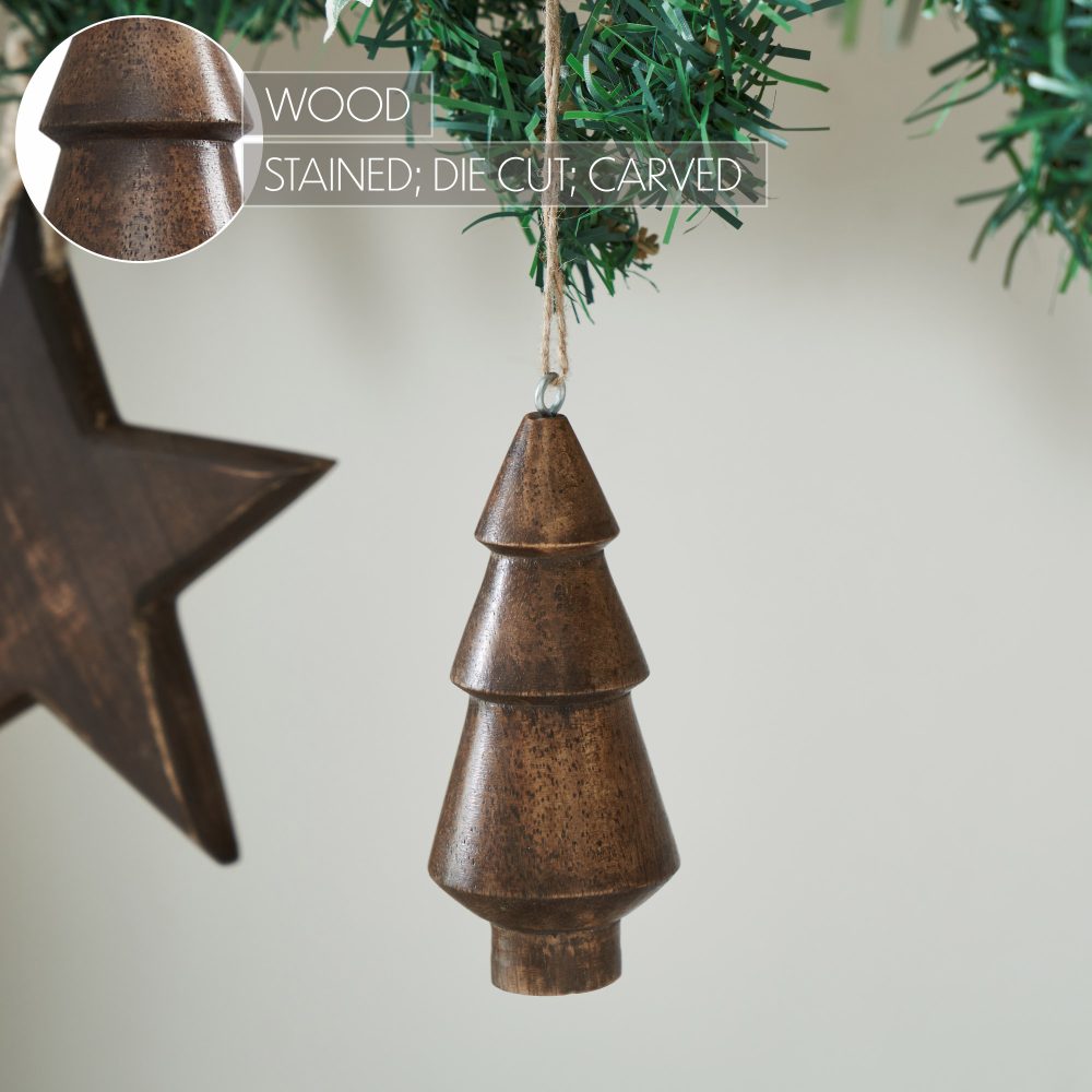 Bring timeless warmth and rustic charm to your holiday setting with the VHC Brands Dark Finish Three-Tiered Hand Turned Tree Set of 6. Expertly crafted from tropical wood, this ornament features a smooth, hand-turned silhouette finished in a rich dark brown stain. The simple, three-tiered design captures the essence of primitive style, offering a cozy, understated accent for your winter decor. Measuring 2x4.5 inches, this ornament is perfectly sized for adding depth and variety to your Christmas tree or seasonal displays. The twine hanger adds a natural touch, making it easy to incorporate into garlands, wreaths, or rustic centerpiece arrangements. Its solid color and classic form make it a versatile piece that pairs effortlessly with both neutral and traditional holiday palettes. Designed for display in any room-from the living room and dining area to entryways and bedrooms-this hand-turned tree ornament elevates your space with subtle texture and natural beauty. Simply wipe clean with a soft cloth to keep it looking festive year after year, and enjoy its enduring style through countless Christmas seasons.