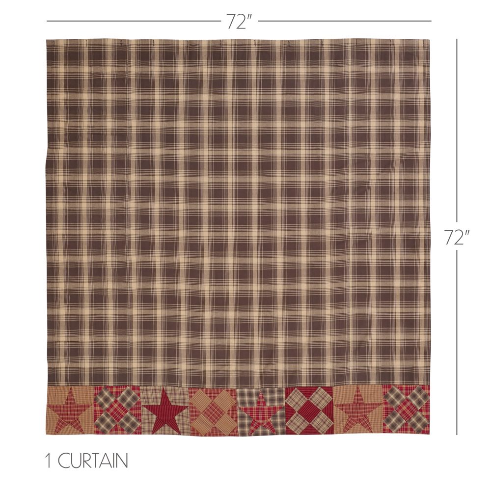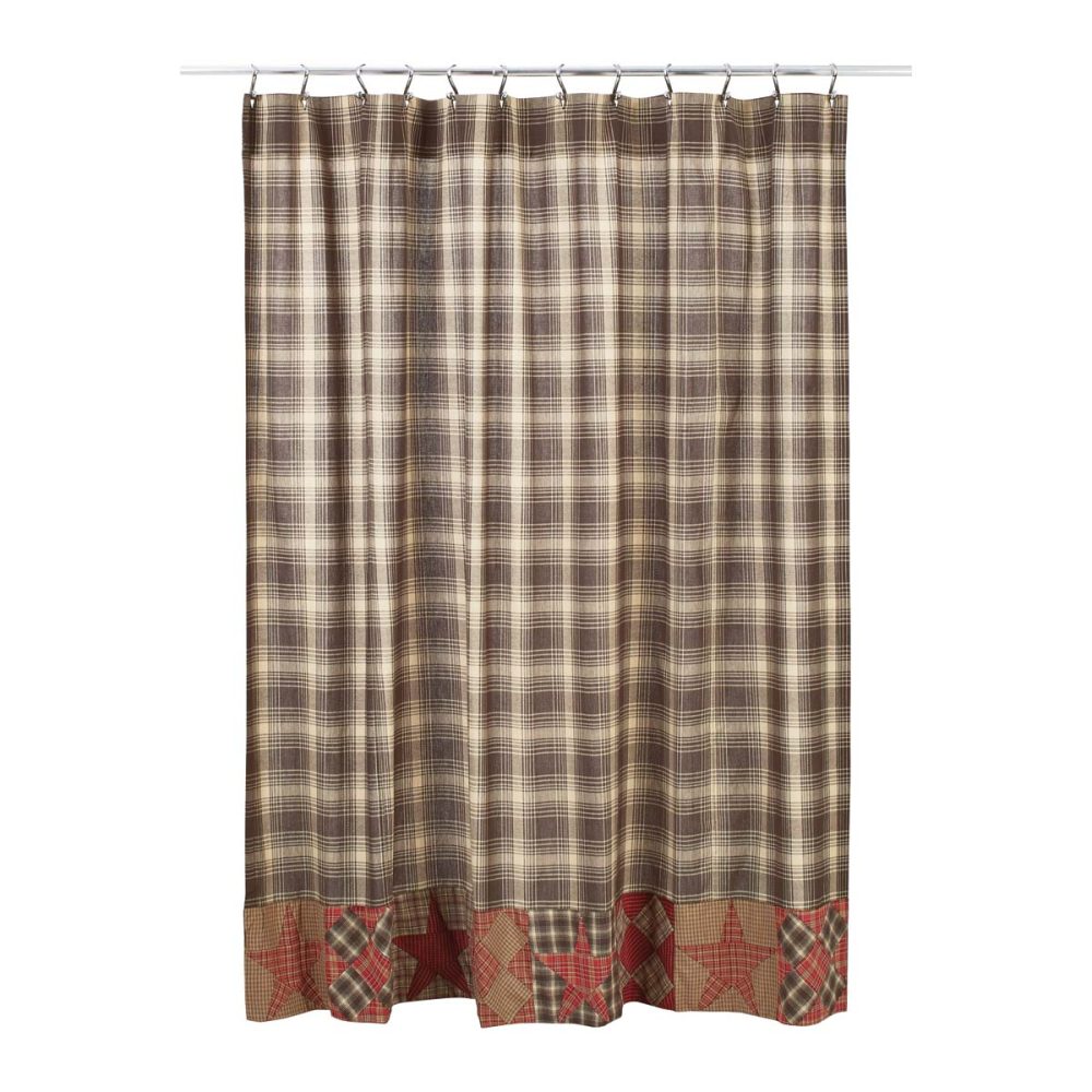 Decorate your bathroom with the perfect blend of simplicity and warm country charm with the Dawson Star Patchwork Shower Curtain. Featuring a rustic brown plaid base and a patchwork border in tan and burgundy with alternating blocks of stars and blocks, our 72x72 fabric shower curtain provides a classic country touch to your decor. This machine washable, 100% cotton shower curtain includes button holes for shower hooks and a rod pocket for versatility and convenience.