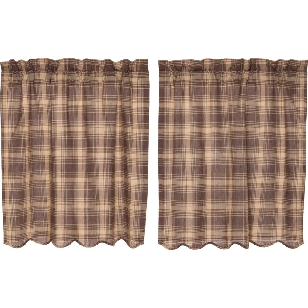 Add vintage lodge style in a warm, neutral plaid. The woodland brown and broad tan stripes with scalloped edging make the Dawson Star Scalloped Tier Set the perfect balance of inviting and rustic. The classic country tier set measures 36x36 inches and provides a relaxed, rustic touch to your kitchen, dining room, or living room. The 100 percent cotton design includes a rod pocket and hanging loops for convenience. A white lining helps this curtain diffuse light in your home.