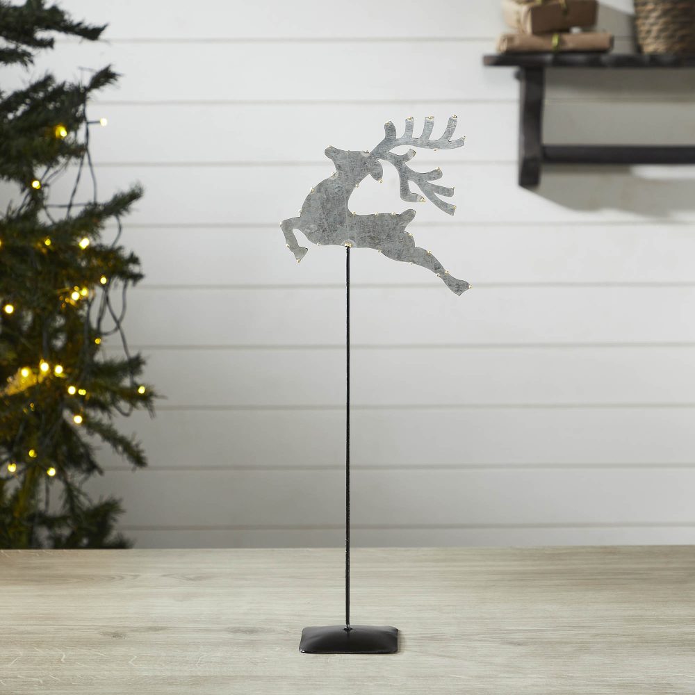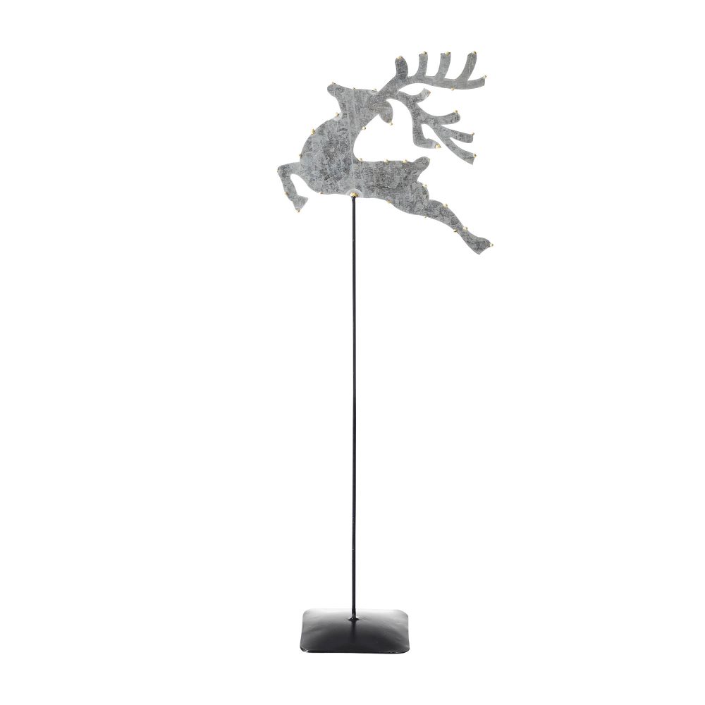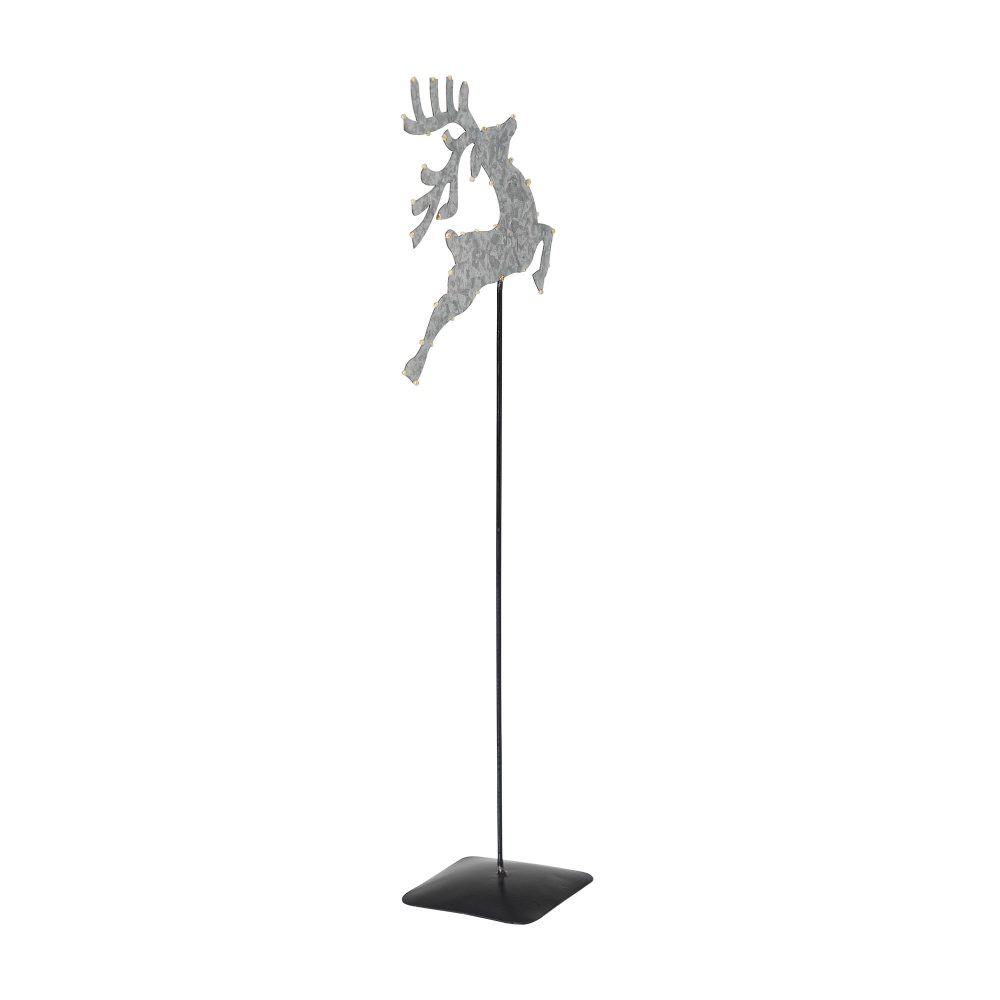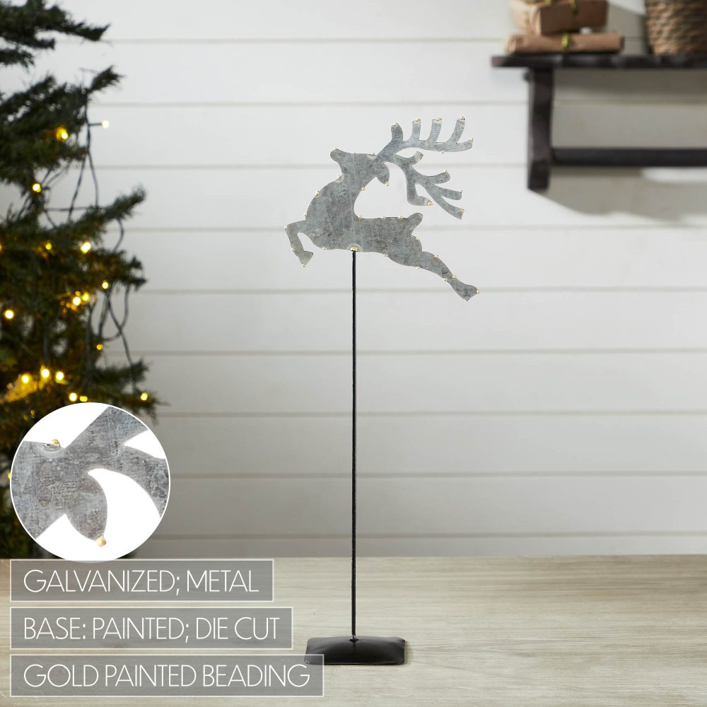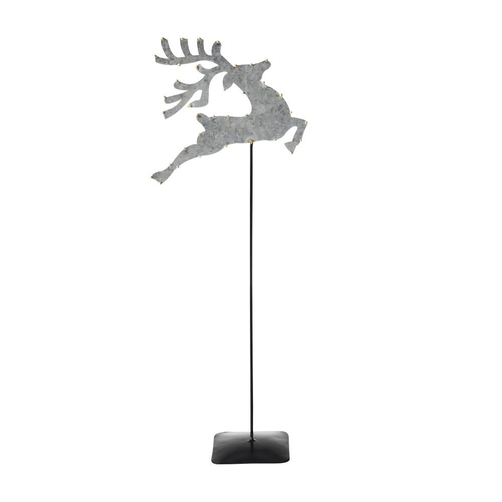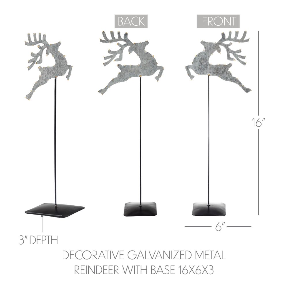 - Presenting our Metal Decorative Galvanized Metal Reindeer With Base, a captivating addition to your winter and Christmas home decor, featuring a majestic reindeer design with gold beading on the edges, mounted on a metal stem and base, measuring 16x6x3 inches.