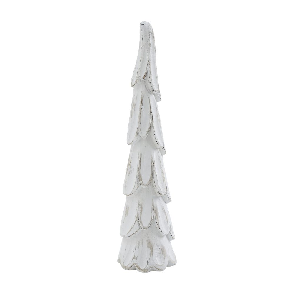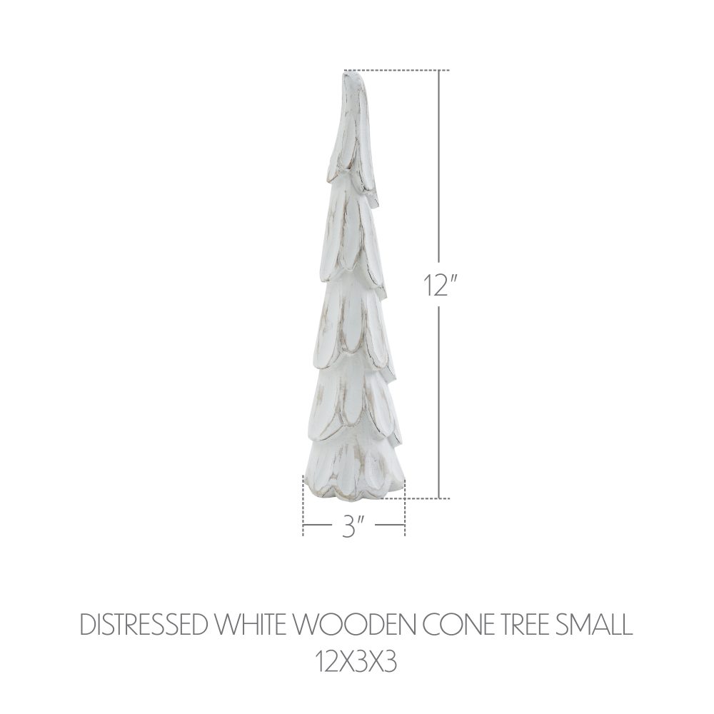 Introduce a soft, rustic charm to your holiday display with the VHC Brands Distressed Wooden Cone Christmas Tree in Small. Expertly crafted from tropical wood, this tall, slender figurine features a cone-shaped silhouette with gently drooping boughs. The whitewash finish paired with light tan accents creates a weathered, primitive look that feels right at home in winter and Christmas decor. Measuring 3 inches wide by 12 inches tall, this compact piece is ideal for styling shelves, mantels, or small tabletop arrangements. The distressed paint and smooth, solid color allow it to blend effortlessly with other seasonal decorations while still offering unique character. Its clean lines and natural texture make it a subtle yet meaningful addition to any space. Perfect for use in the bathroom, bedroom, dining room, entryway, kitchen, or living room, this decorative winter tree adds handcrafted warmth wherever it's placed. The neutral tones and rustic design suit a wide variety of interior styles, from farmhouse to minimalist. To keep it looking its best year after year, simply wipe clean with a soft cloth.