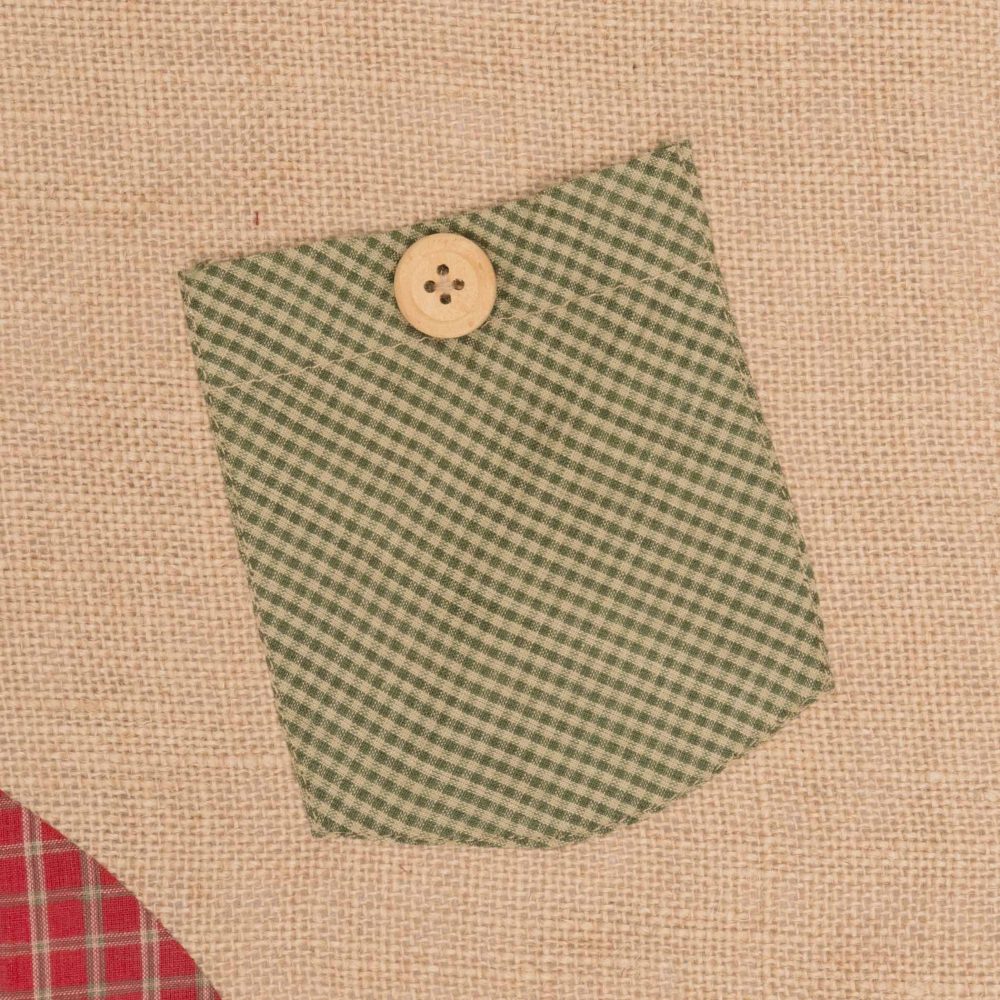 Set the mood for the holidays with a timeless and unique take on primitive style. The 12x20 Dolly Star Green Pocket Stocking features bright red cuff, heel, and toe with an emerald green pocket set on tan. Finished with a hanging loop and wood buttons on the cuff and pocket. 100% cotton shell with flannel and taffeta lining.