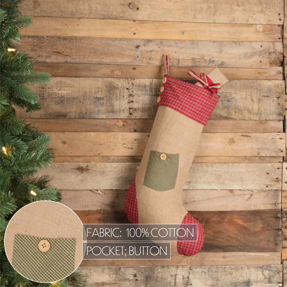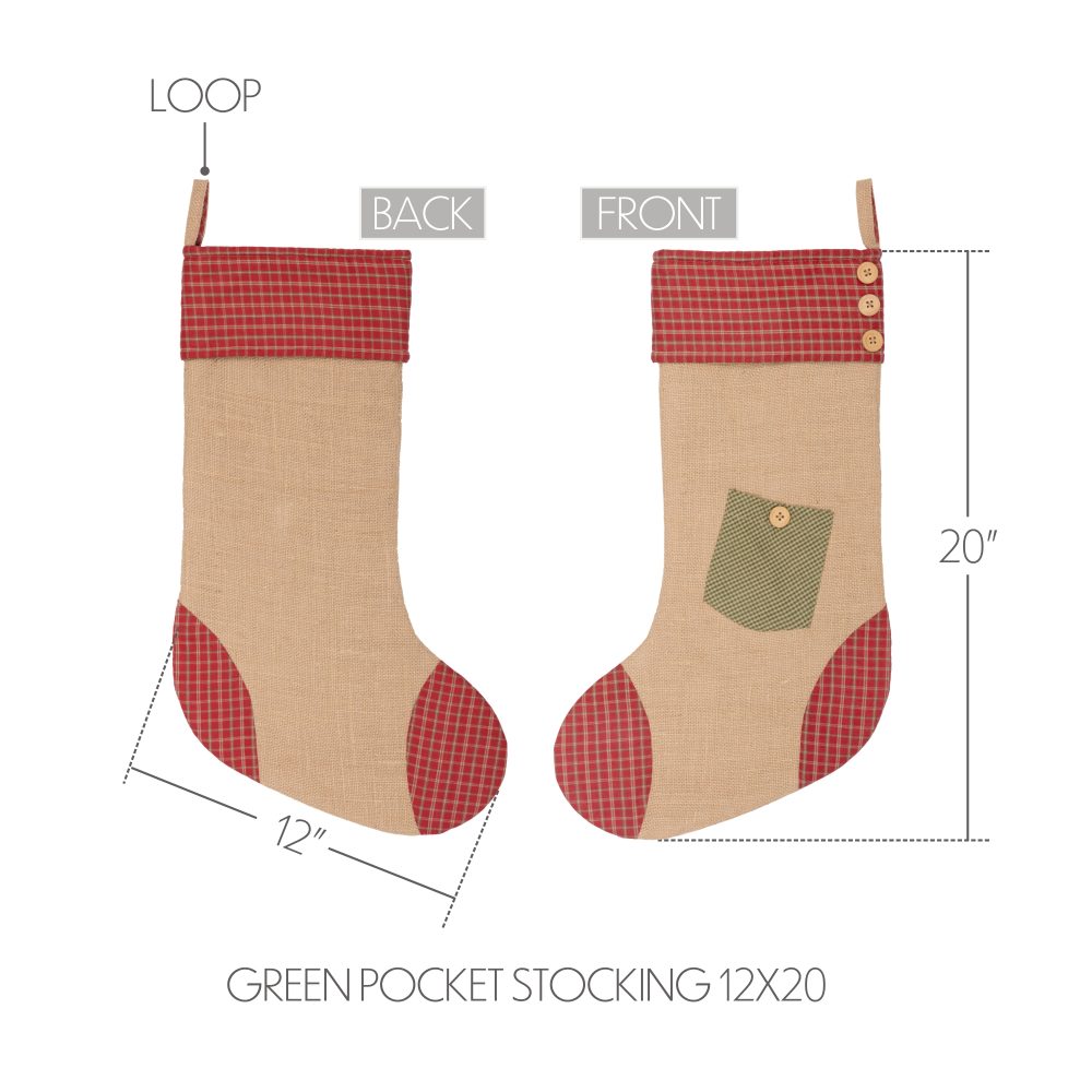 - HOLIDAY DECOR: Decorate your fireplace mantel or stairwell this Christmas season with a festive primitive twist. green, red, and tan cover this holiday stocking showcasing a decorative pocket and buttons to bring elements of a cozy rustic cabin to the living area.
