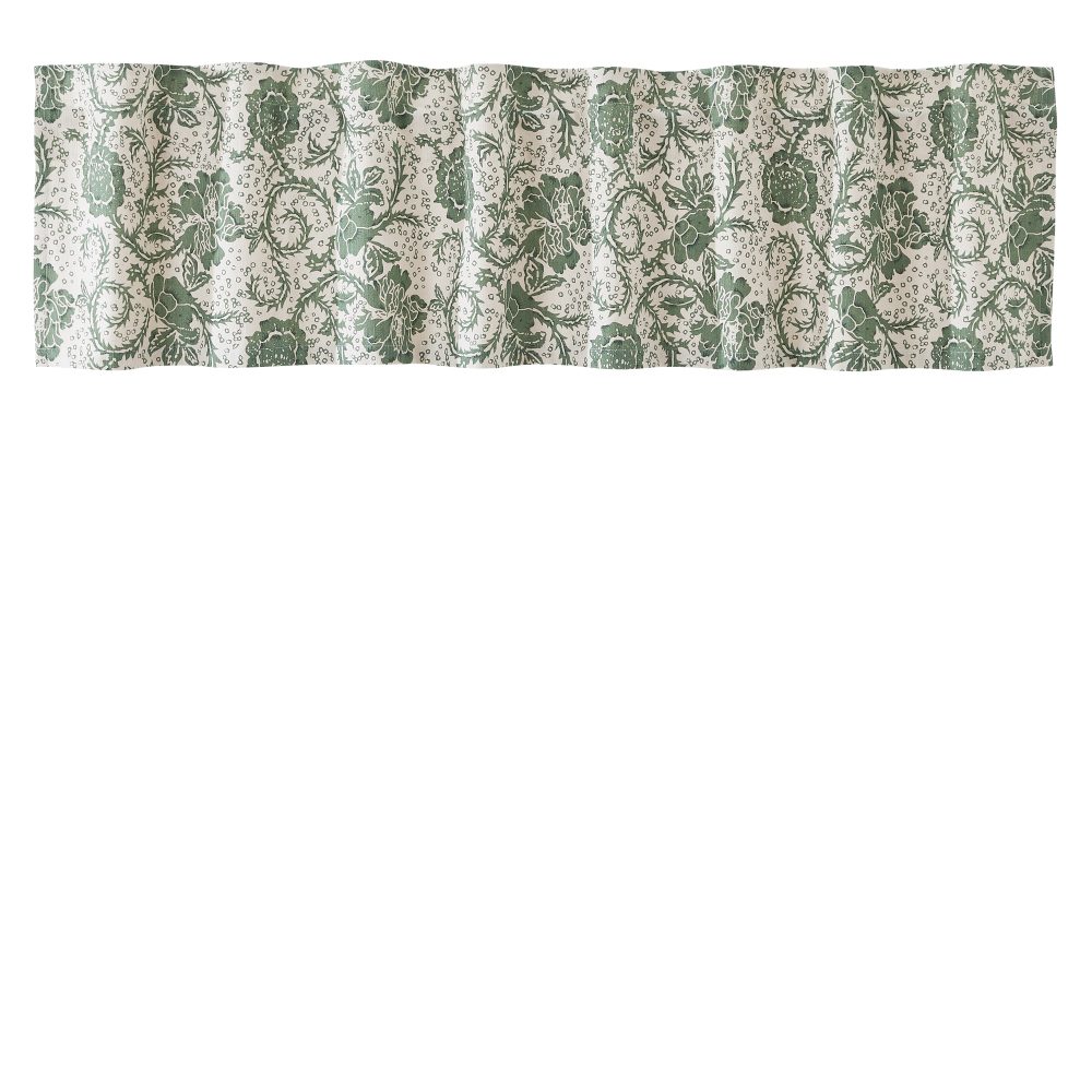 Detailed dark green swirls in a floral design weave across an off-white background to create a soft, vintage look. Our Dorset Green Floral Valance 16x72 is the perfect choice for a variety of decorating styles. From a vintage country kitchen to a cozy cottage living room, this curtain adds charm and interest to any window. A rod pocket is included near the top for easy hanging.