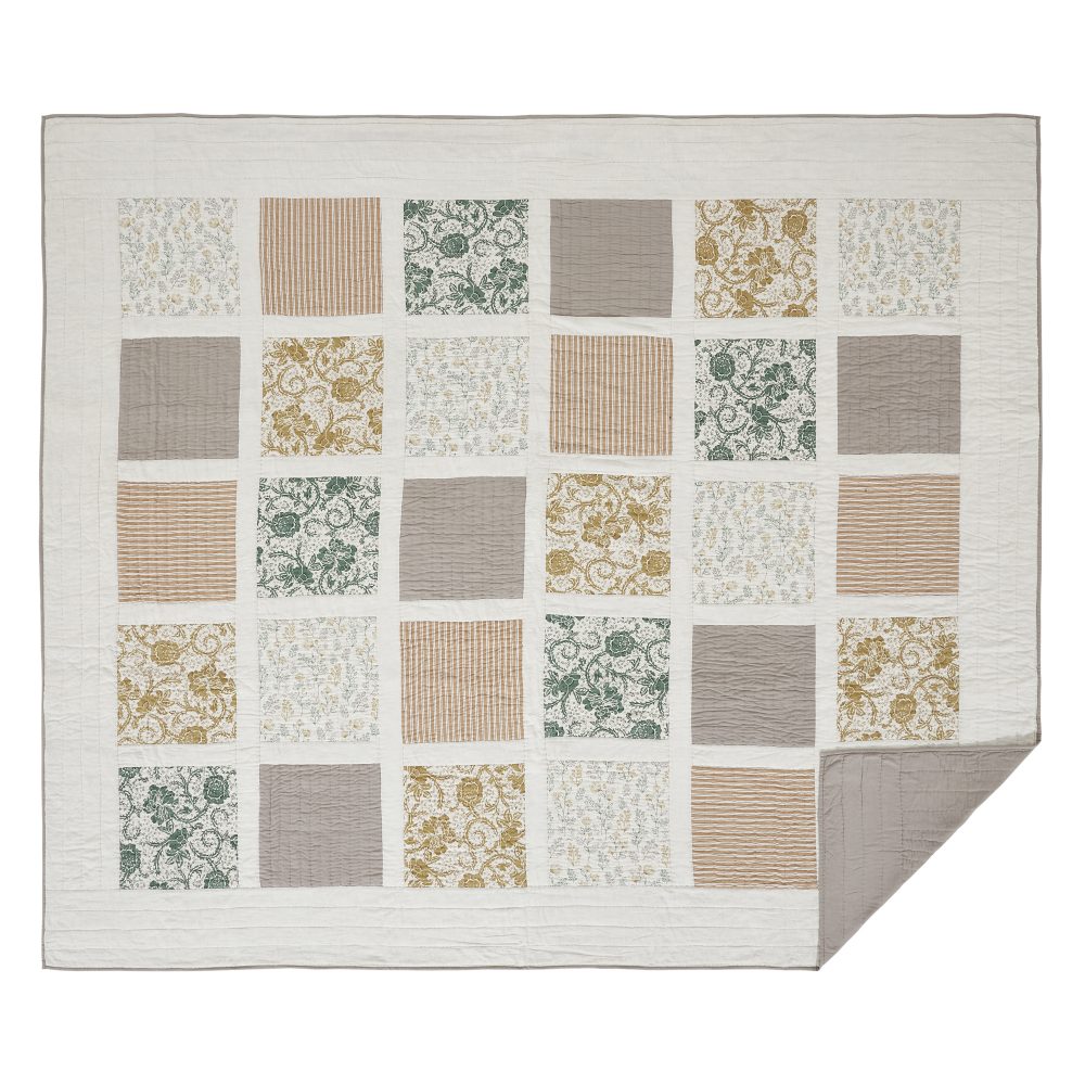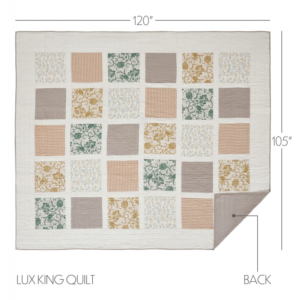 A classic patchwork of floral prints and stripes in rich colors on a neutral creme base bring a sense of vintage elegance to your bed. The Dorset Luxury King Quilt measures 120 by 105 inches. The oversized quilt is backed by a warm and neutral grey-brown fabric and features cotton batting for extra warmth and high-quality stitching with channel and stitch in the ditch quilting techniques. A blend of cotton and linen creates a cool, soft touch with superior durability and easy care. The lightweight bedspread is machine washable and iron safe. Coordinates with the Dorset Collection from VHC for a complete vintage farmhouse look.