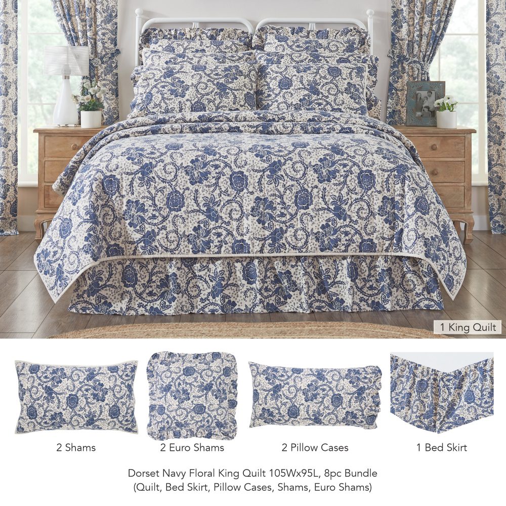 Dorset Navy Floral King Quilt 105Wx95L 8pc Bundle (Quilt, Bed Skirt, Pillow Cases, Shams, Euro Shams)