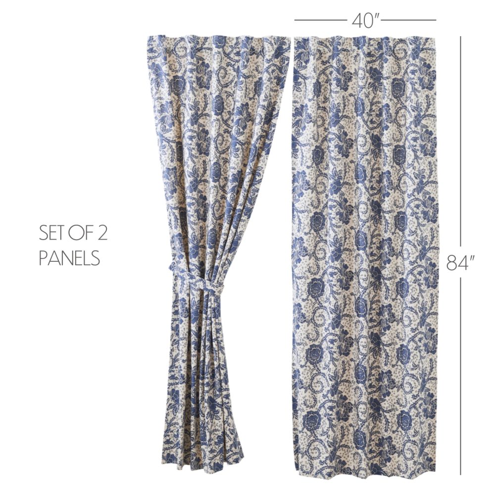 - VINTAGE FARMHOUSE PANELS: Set of two 84 by 40 inch country-style window panels adds soft, cottage charm to your home with gorgeous floral in a navy blue tint. Includes matching tie backs.