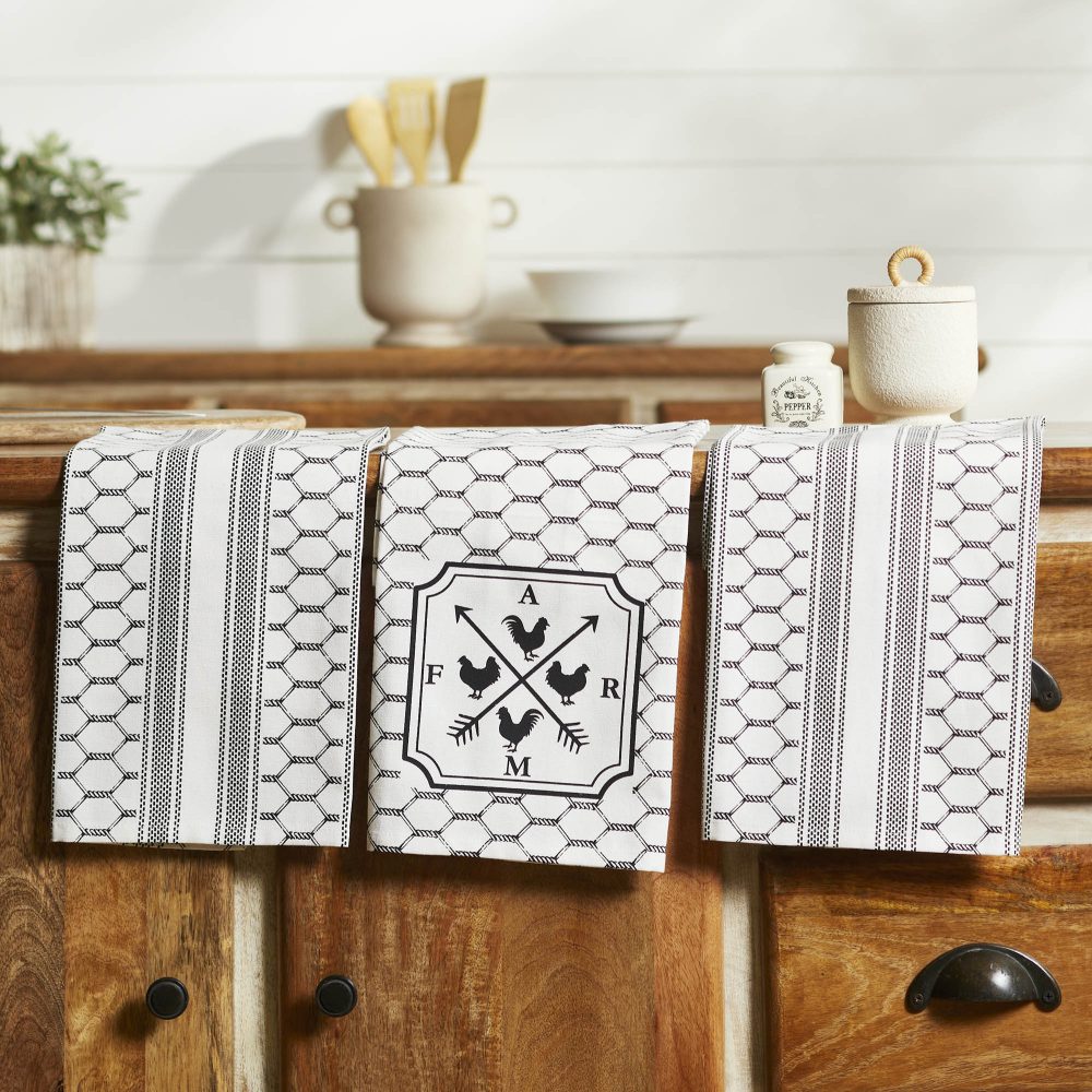 • Whether it’s for fall, Easter, or everyday use, these tea towels are both decorative and practical. Their white background with cute chicken and fence patterns brings a barnyard twist to your kitchen.