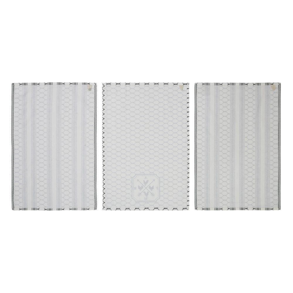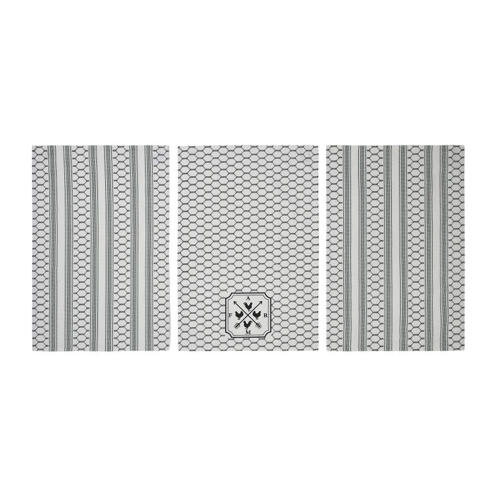 • Set of 3 Towels: Towel 1 showcases two arrows crossed in a weathervane style with FARM at the compass points and Chickens directing the way. The other two towels feature fence and stripe detail.