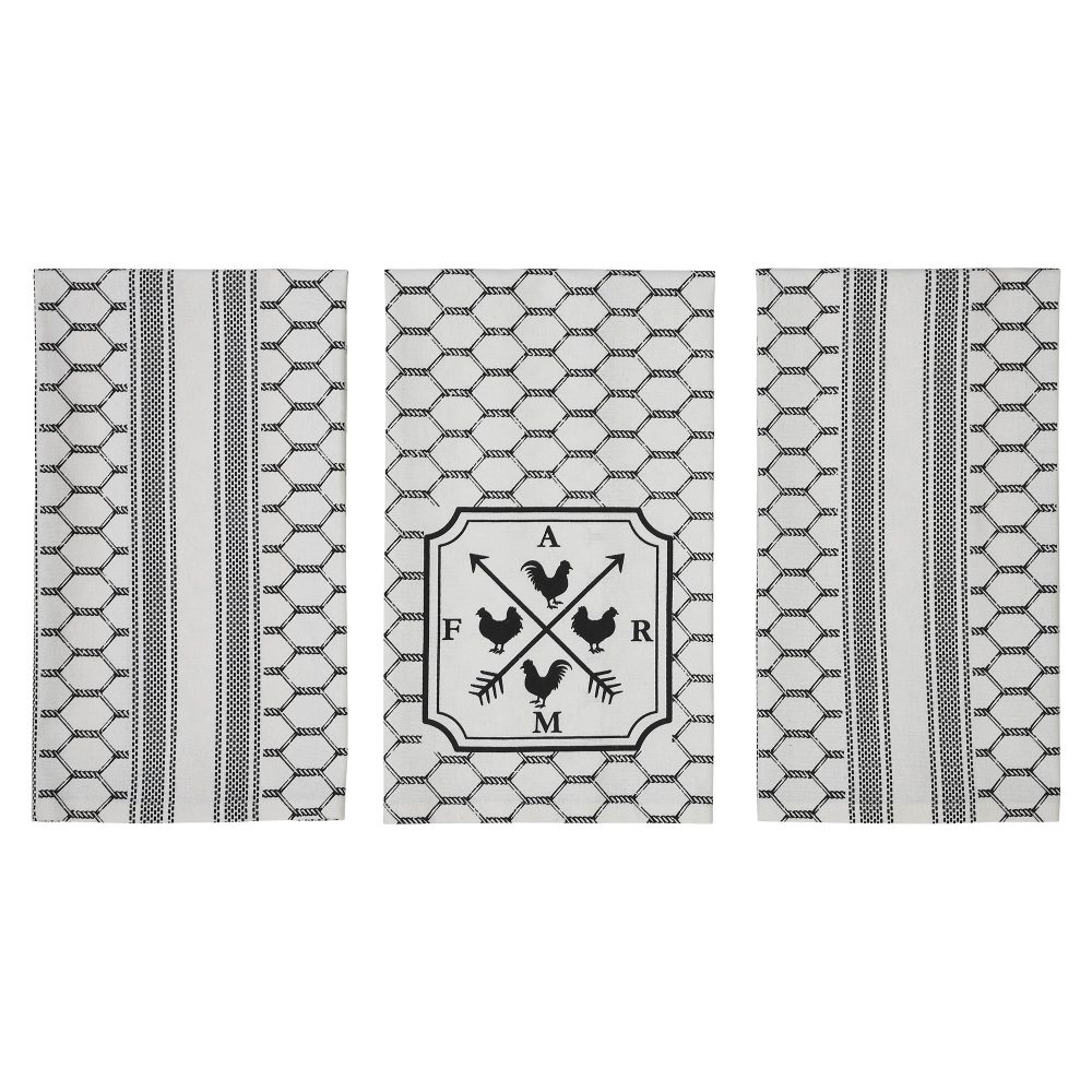Enhance the country charm of your farmhouse kitchen with the VHC Brands Down Home Collection Cotton Kitchen Towel Set of 3. These printed tea towels boast weathervane style graphic with FARM at the points, arrows and chickens, making them perfect for any farmhouse-style kitchen. Designed from premium cotton, these textured towels are not only decorative but also highly functional, ideal for various kitchen tasks, from drying dishes to tackling everyday spills. Measuring a generous 28x19 inches each, these tea towels offer ample coverage and utility in your kitchen. Their soft white backdrop adorned with cute and decorative designs adds a modern farmhouse touch to your home, making them suitable for all occasions, including fall and Easter. Crafters and DIY enthusiasts will appreciate these towels, opening up endless creative possibilities for crafts and decorative projects. Made to withstand the rigors of daily use, these durable cotton towels are both stylish and practical, ensuring they maintain their decorative flair while being your reliable kitchen companions. Whether you're looking to refresh your farmhouse-inspired kitchen or seeking versatile tea towels for crafting, the VHC Brands Down Home Collection Cotton Kitchen Towel Set combines the perfect blend of country aesthetics, quality, and decorative versatility.