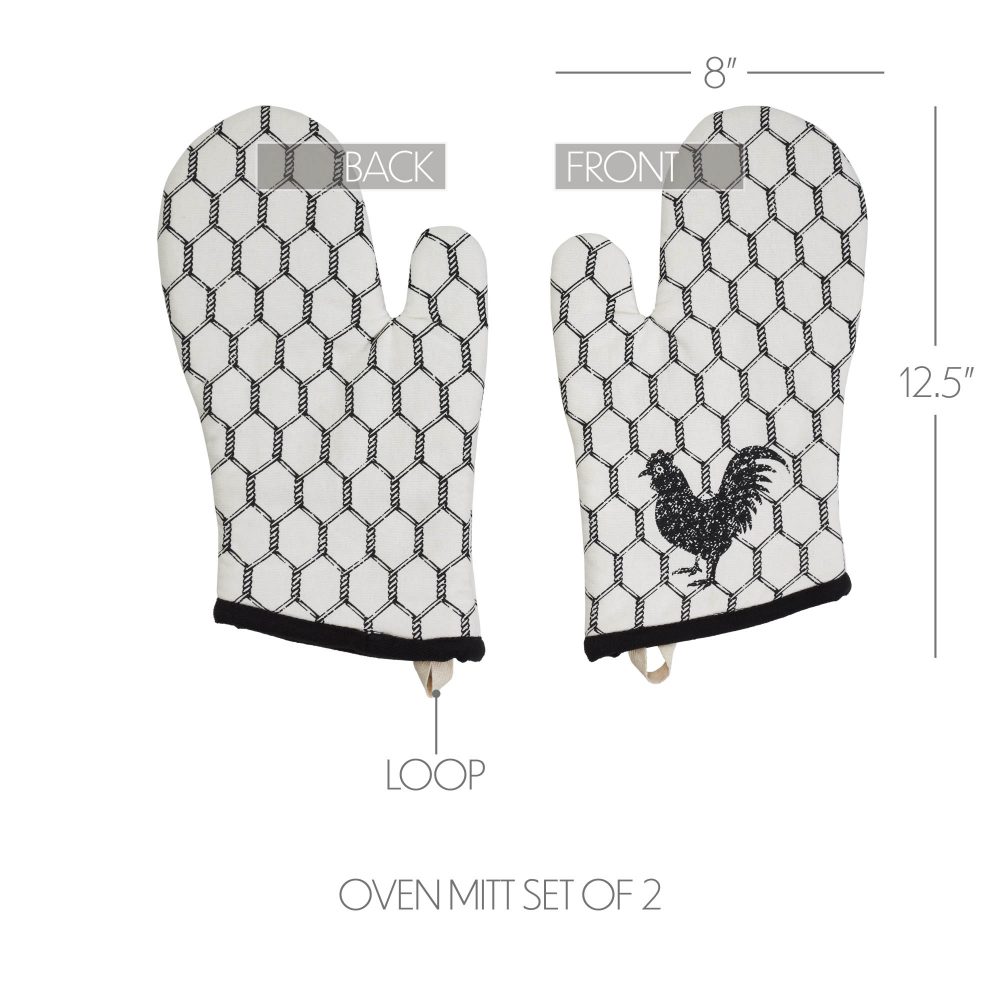 - Farmhouse Inspired: This oven mitt set of 2 showcases a rooster on a chicken wire background in tones of distressed black and soft white. Part of the Down Home Collection enhancing your kitchen with charming country and farmhouse style.