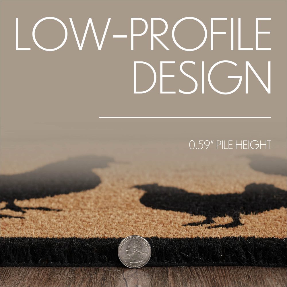 Welcome your guests with rustic charm using the VHC Brands Down Home Rooster & Hens Coir Welcome Rug Half Circle 16.5x33. This farmhouse-inspired rug features a natural tan coir base, showcasing the stenciled silhouettes of a rooster and two hens in country black, creating a warm, countryside vibe. The black border adds a bold accent, making it the perfect addition to any farmhouse or country-style home. Ideal for entryways, this rug is both decorative and functional, designed to trap dirt and debris while bringing a touch of barnyard charm to your home. The half-circle shape fits snugly against your doorstep, and the non-slip PVC backing ensures the rug stays securely in place. Its durable coir construction makes it great for high-traffic areas, while the rooster and hens design adds a welcoming, down-home feel to your space. To maintain the vibrant colors and prolong the life of the rug, it's best to place it in a sheltered entryway and clean it by shaking or vacuuming to remove surface dirt. The VHC Brands Down Home Rooster & Hens Coir Welcome Rug blends rustic farmhouse style with everyday practicality, making it a perfect choice for anyone who loves country living and wants to bring that charm right to their doorstep.