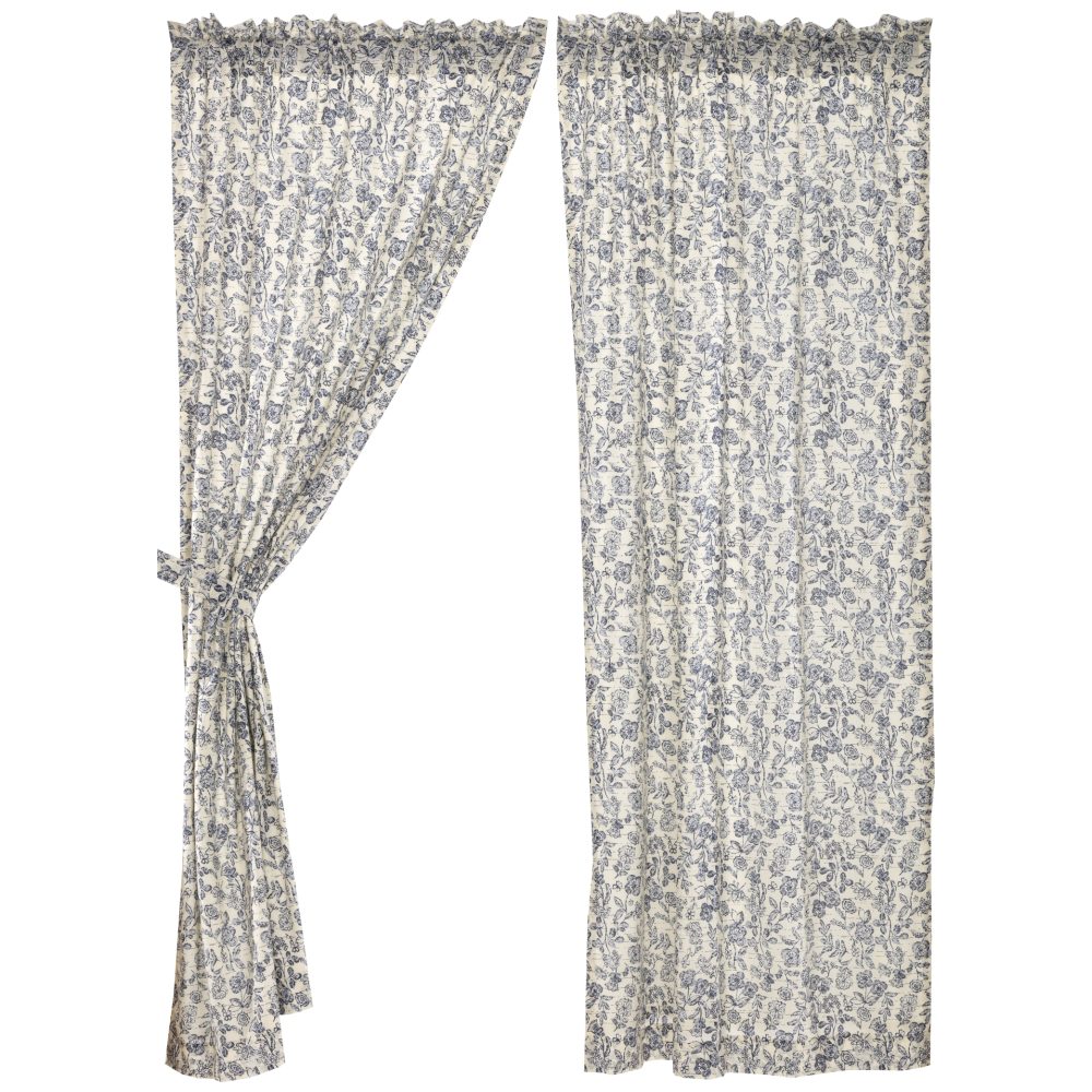 - FARMHOUSE FLORAL: These curtains feature a two-tone denim blue floral print on creme cotton slub base fabric; LIGHT FILTERING: Lined with white cotton to reduce fading and light penetration; QUALITY FINISH: Finished with our standard .75″ hem fold; OPTIONAL DISPLAY: Includes 2 matching tie-backs to pull either one side or both sides of curtain back; SINGLE FABRIC: Machine stitched