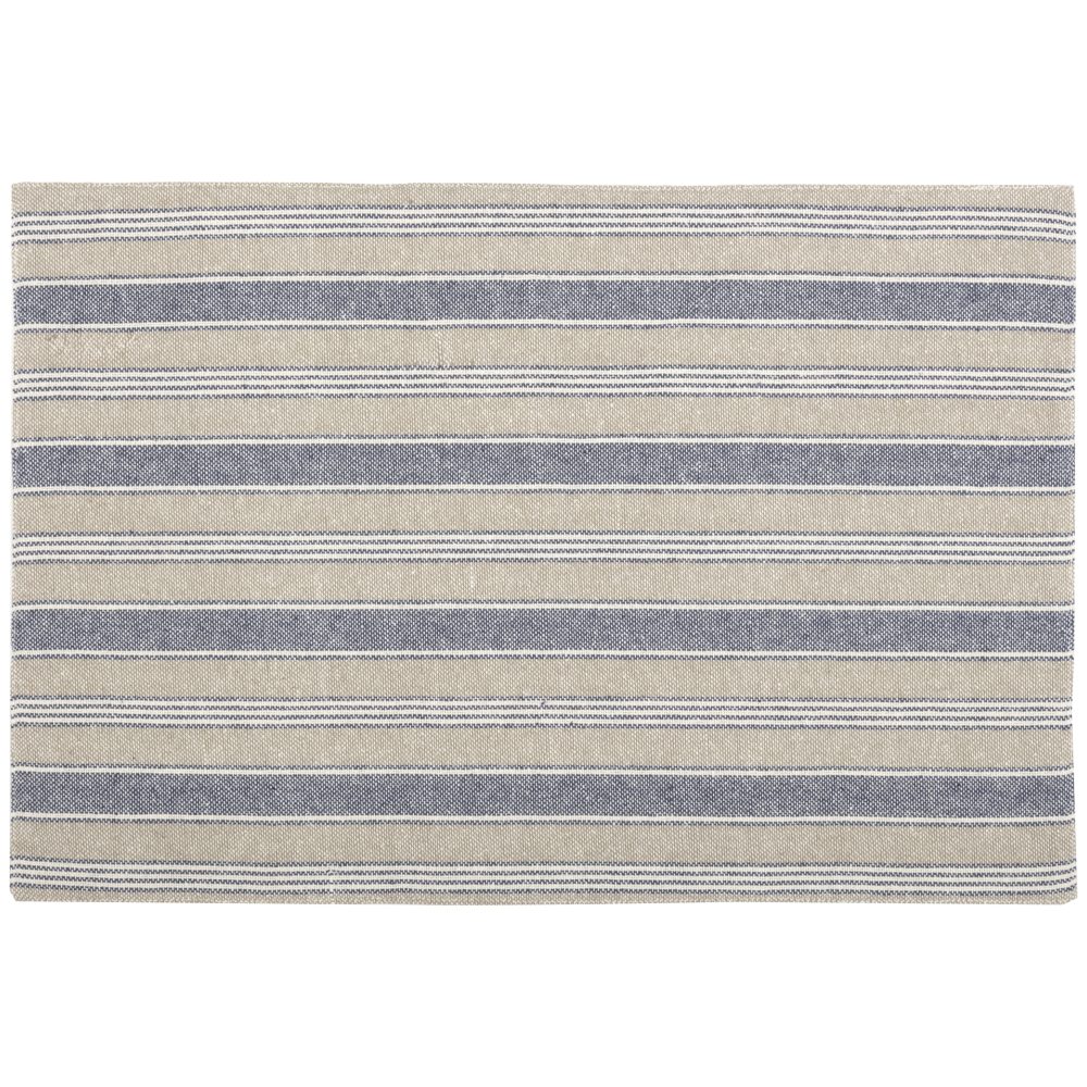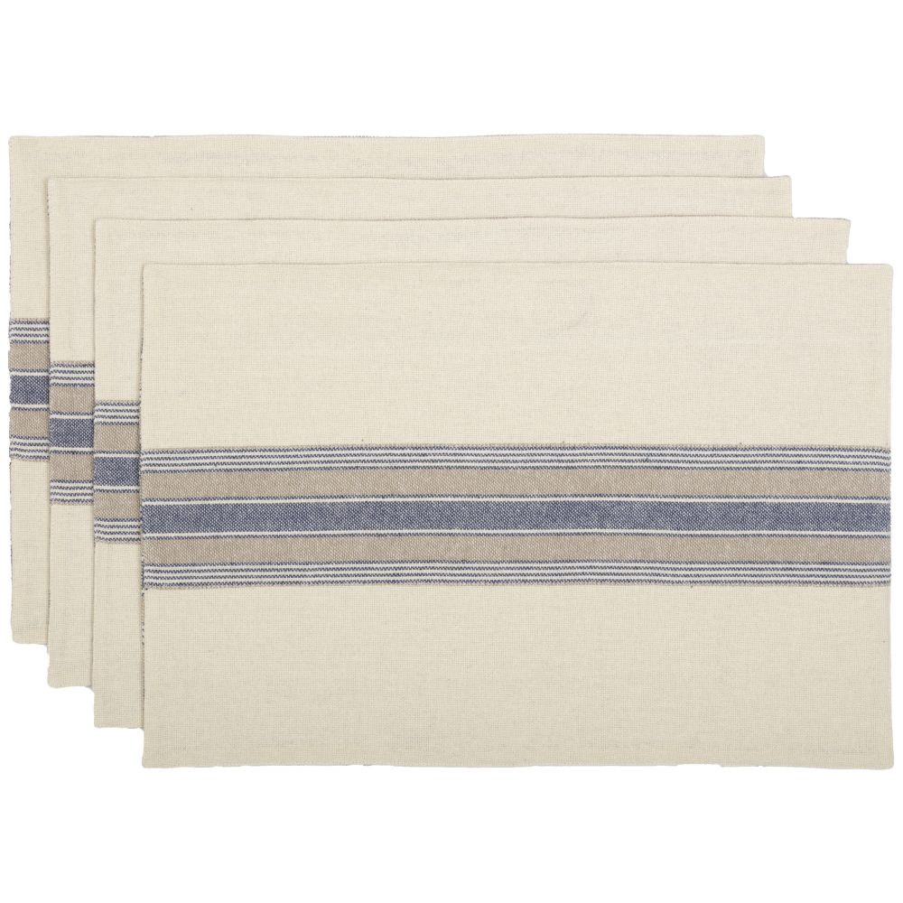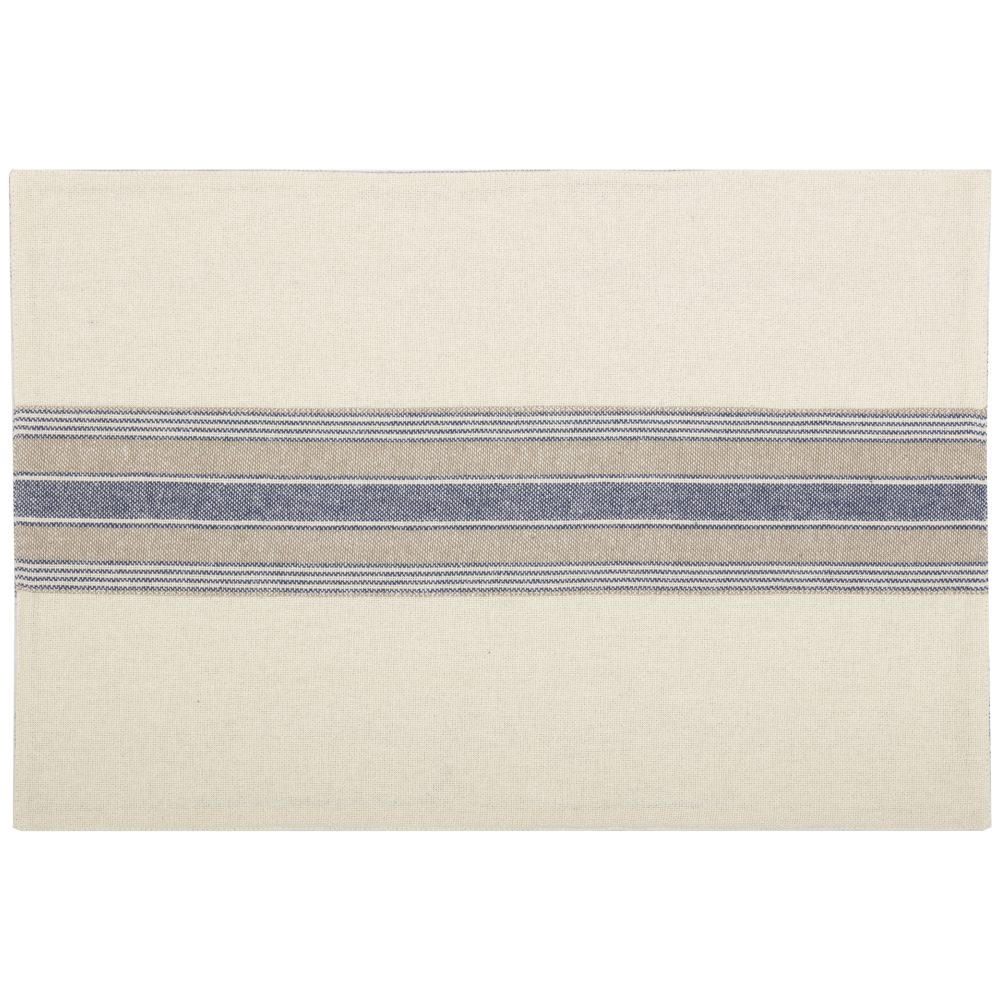 • GRAIN SACK STRIPE: Each placemat features a single grainsack stripe applique, placed horizontally across the center, in denim blue, creme, and khaki fabric; COTTON SLUB: Creme base material is a textured cotton slub; ATTENTION TO DETAIL: Lined with flannel for additional thickness; CLEAN DESIGN: Each placemat is finished with a simple, turned edge seam; REVERSIBLE: Reverses to denim blue, creme, and khaki striped woven fabric; ASSORTED FABRICS: Machine stitched