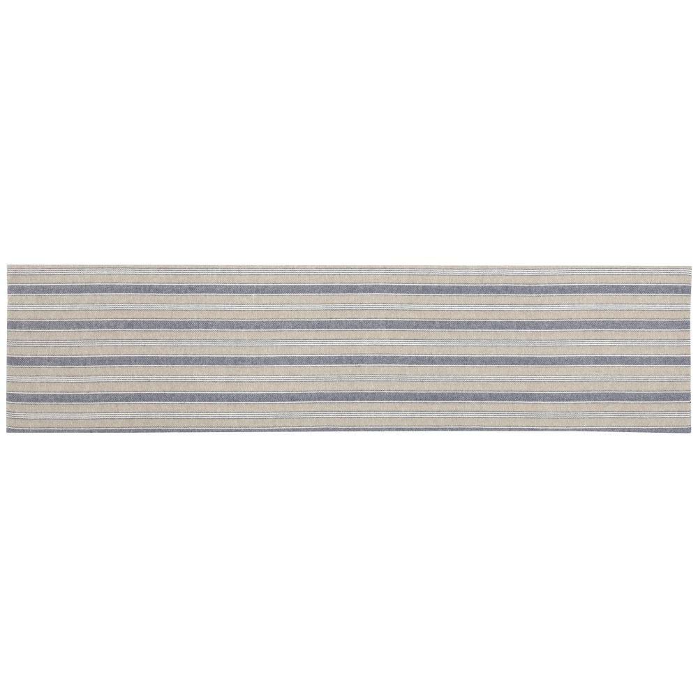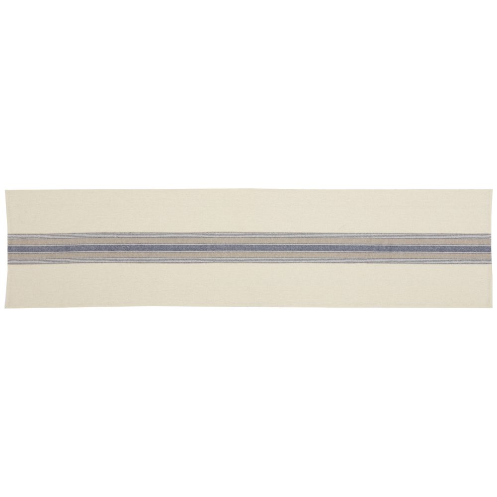 - GRAIN SACK STRIPE: This table runner features a single grainsack stripe applique, placed horizontally across the center, in denim blue, creme, and khaki fabric; COTTON SLUB: Creme base material is a textured cotton slub; ATTENTION TO DETAIL: Lined with flannel for additional thickness; CLEAN DESIGN: This table runner is finished with a simple, turned edge seam; REVERSIBLE: Reverses to denim blue, creme, and khaki striped woven fabric; ASSORTED FABRICS: Machine stitched