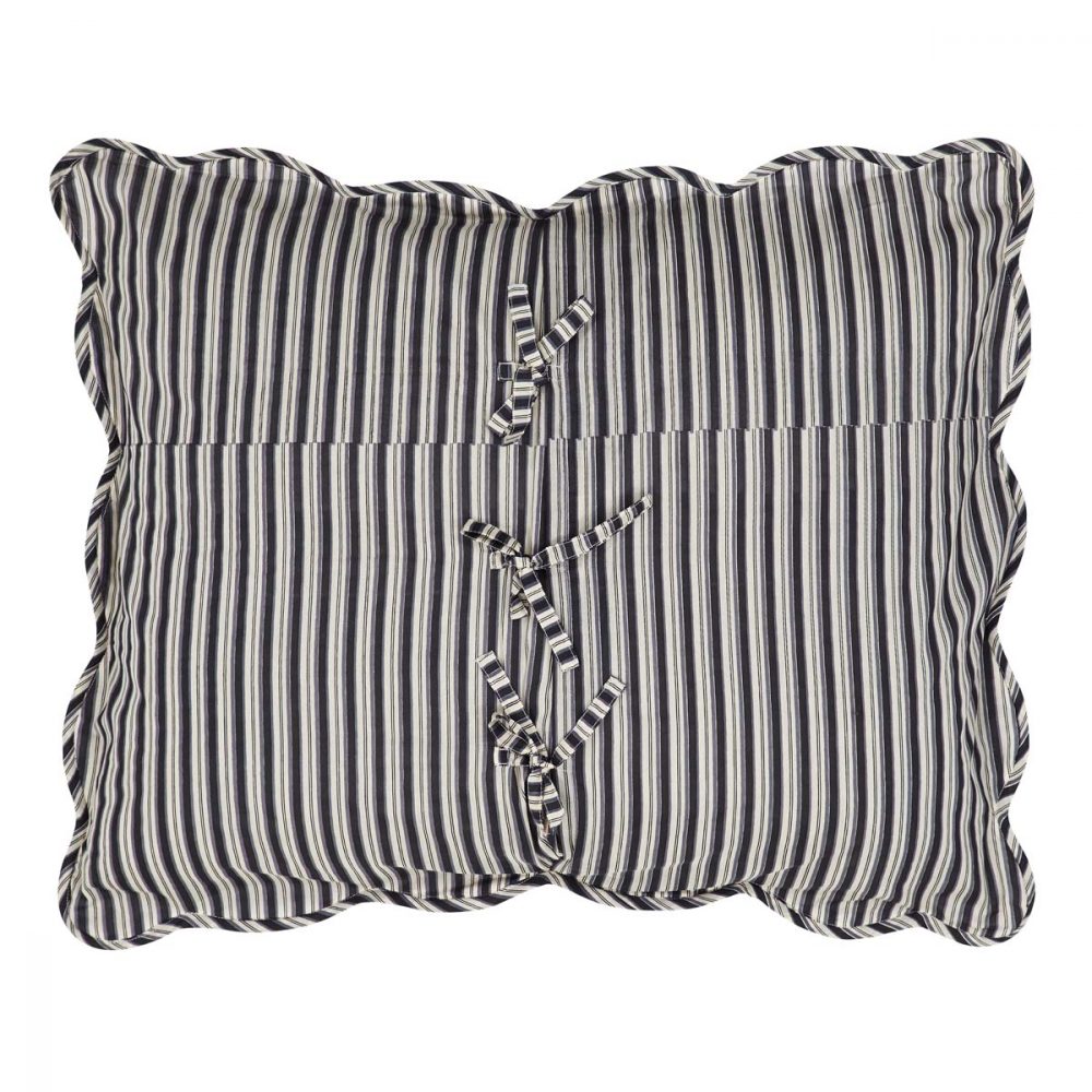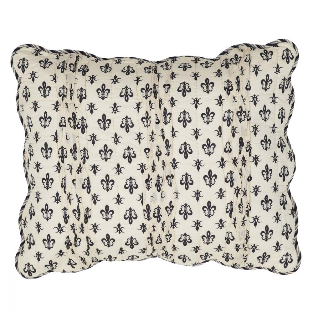 Dress your pillows in old world bliss with the Elysee Standard Sham. "Elysee", also the name of a famous palace in Paris, translates from the French to "Elysium". By its name, our black, charcoal, and creme pillow cover brings to mind delightful vintage elegance and gorgeous historical fancy. Alternating bands of channel quilting and lightweight cotton voile create a soft ruffled look, while the fleur-de-lis print pattern and scalloped edge provide a classic touch. Machine washable and iron-safe, this 21x27 Parisian-inspired pillow sham adds timeless class to your French country, shabby chic, farmhouse, or vintage country decor. Reverses to dark grey, black, and creme ticking stripes with 3 ties for closure.