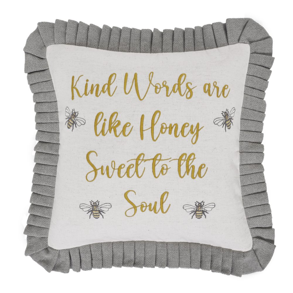 Relax in comfort with soft texture and embroidered detailing. The 18x18 inch Embroidered Bee Pillow features a cotton flax base fabric with text and bee embroidery in natural creme, soft yellow, and charcoal grey. Word art reads, Kind Words are Like Honey, Sweet to the Soul in a loopy, yellow script. Accented with ruffled grey edging in a soft burlap and button-style closures on the pillow's reverse side. Includes polyester fill. For a country farmhouse look with the quality you've come to expect from over 25 years of happy customers, pair with other charming bee accessories from the Embroidered Bee Collection by VHC.