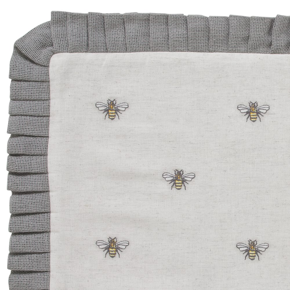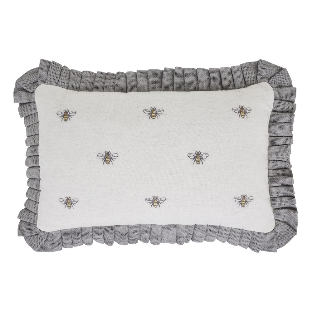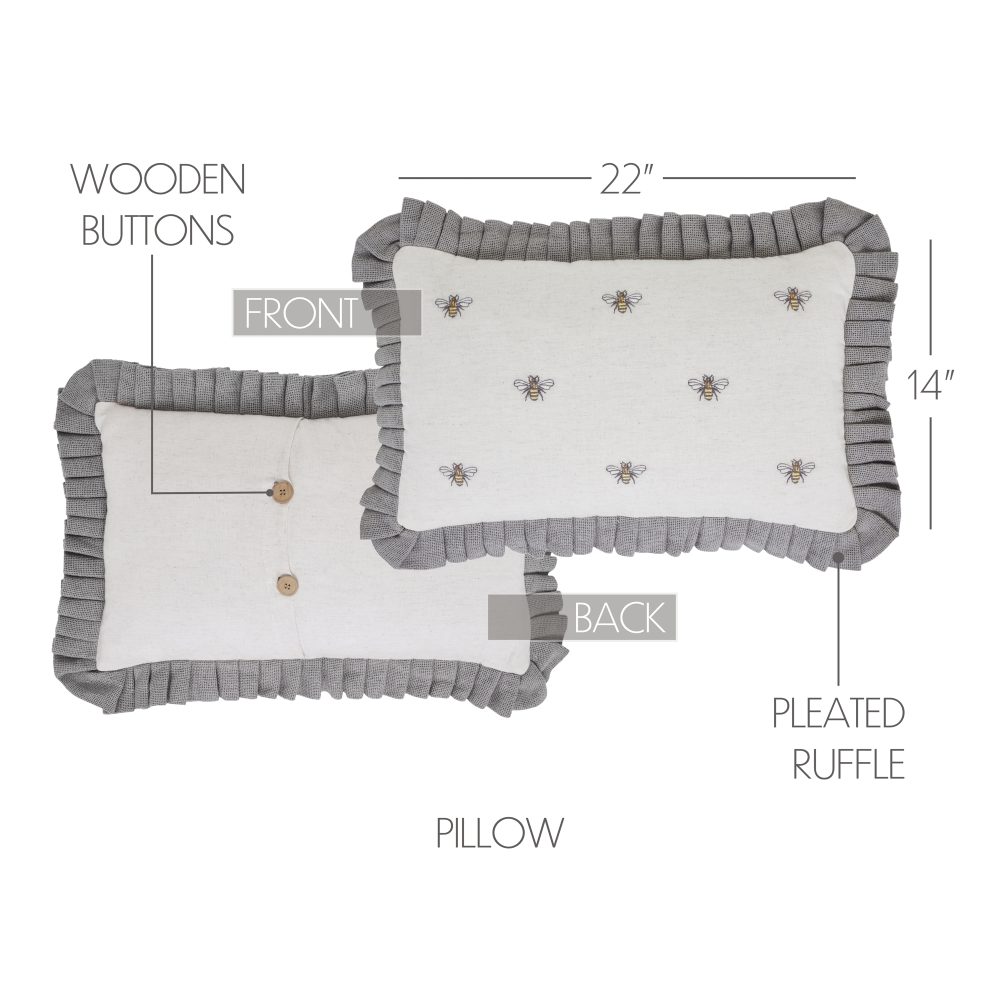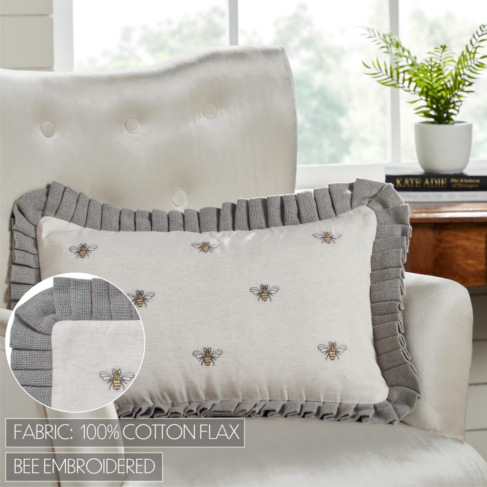 Relax in comfort with soft texture and embroidered detailing. The 14x22 inch Embroidered Bee Pillow features a cotton flax base fabric with bee embroidery in natural creme, soft yellow, and charcoal grey. Accented with ruffled grey edging in a soft burlap and button-style closures on the pillow's reverse side. Includes polyester fill. For a country farmhouse look with the quality you've come to expect from over 25 years of happy customers, pair with other charming bee accessories from the Embroidered Bee Collection by VHC.