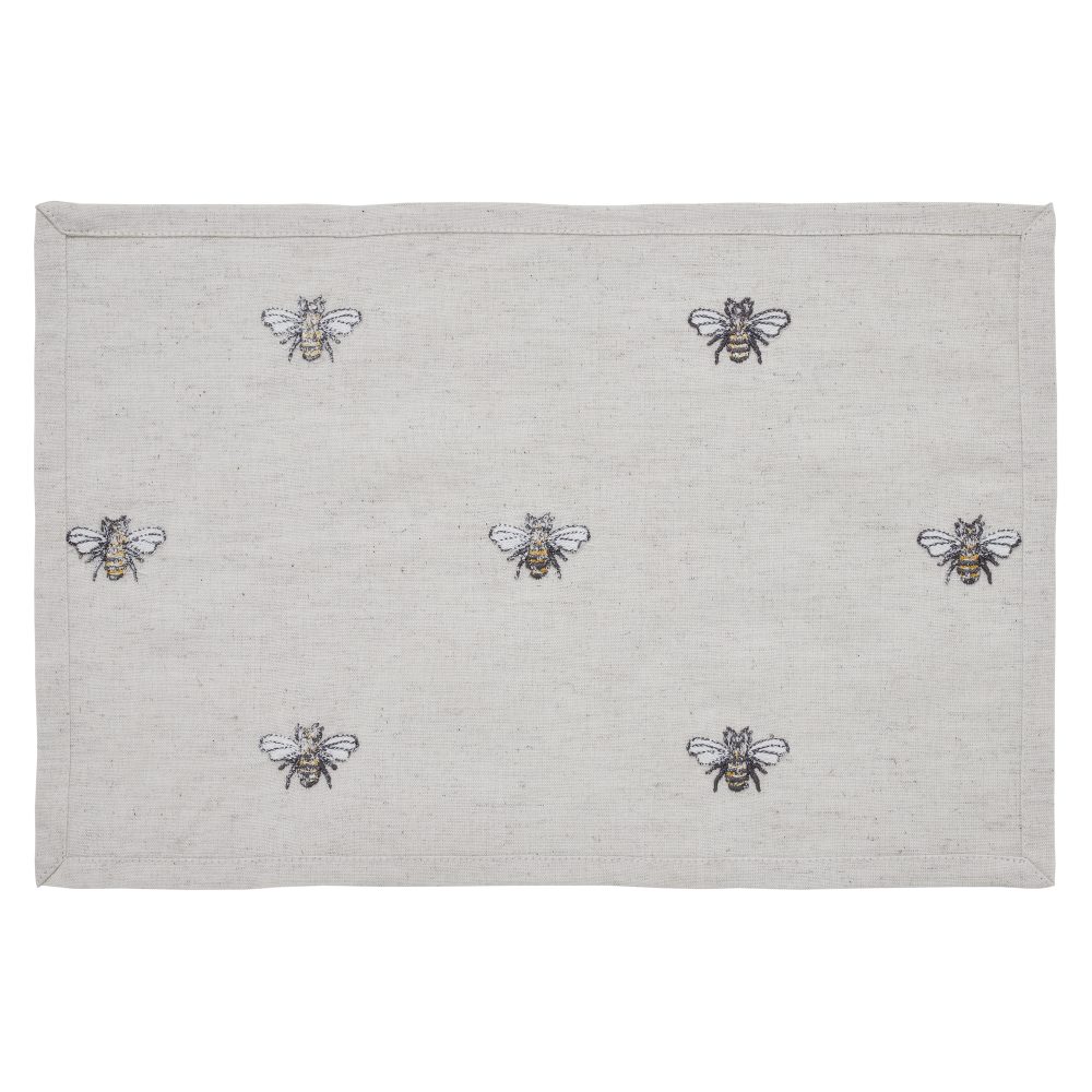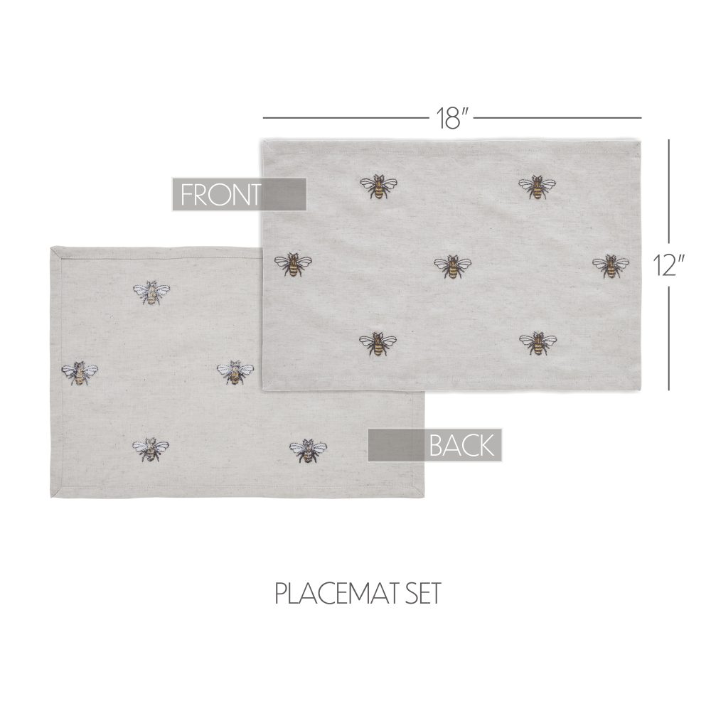 Create a joyful table for friends and family to gather round with a charming cottage-friendly design. The Embroidered Bee Placemat Set includes a set of six placemats measuring 12x18 inches. The rich texture and straight edging of the cotton-linen blend fabric is given a timeless feel with a natural creme color for soft, modern country vibes. Whimsical bees are embroidered across each mat for a cheerful look that will have guests buzzing. Complete your tabletop decor with other pieces from the Embroidered Bee Collection by VHC for modern farmhouse style.