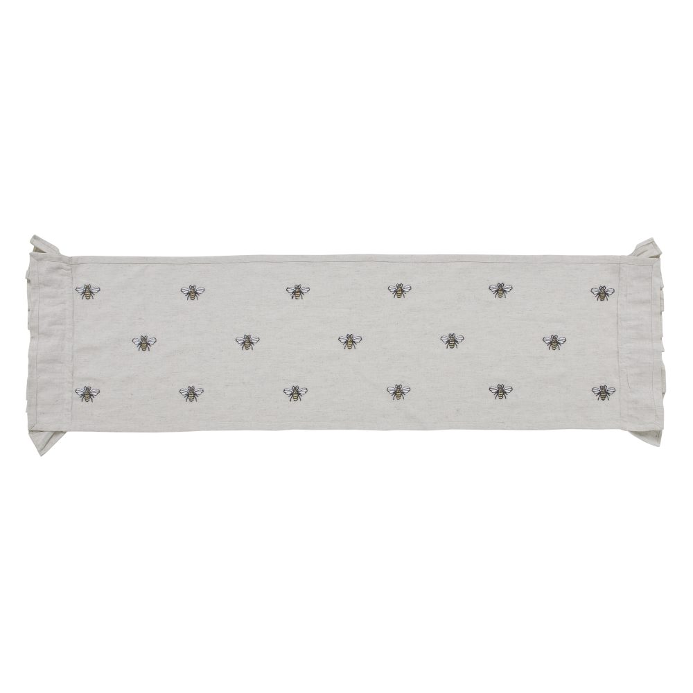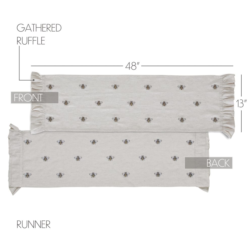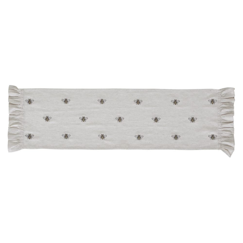 Create a joyful table for friends and family to gather round with a charming cottage-friendly design. The Embroidered Bee Runner includes one table runner measuring 13x48 inches. The rich texture and ruffled edging of the cotton-linen blend fabric is given a timeless feel with a natural creme color for soft, modern country vibes. Whimsical bees are embroidered across each runner for a cheerful look that will have guests buzzing. Complete your tabletop decor with other pieces from the Embroidered Bee Collection by VHC for modern farmhouse style.