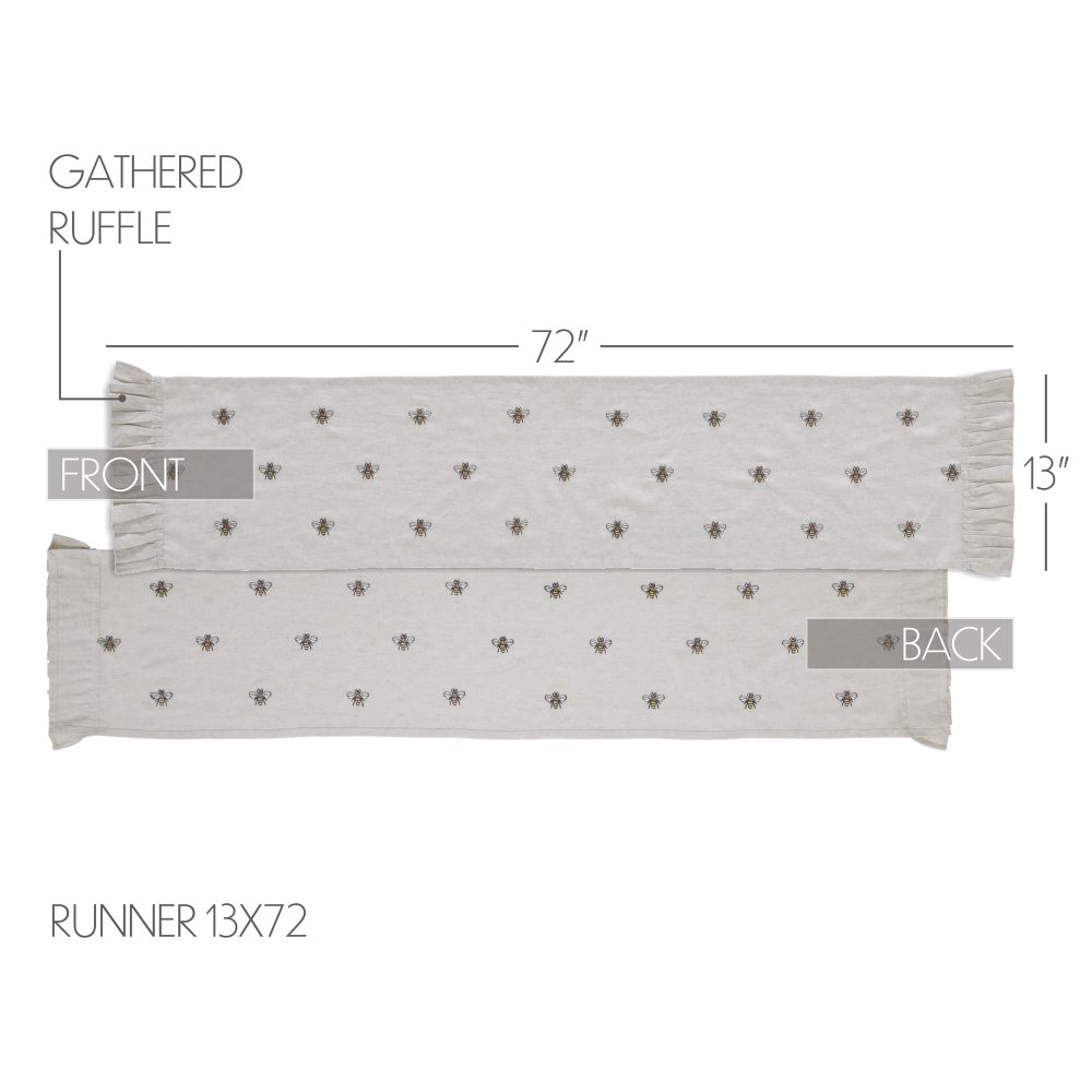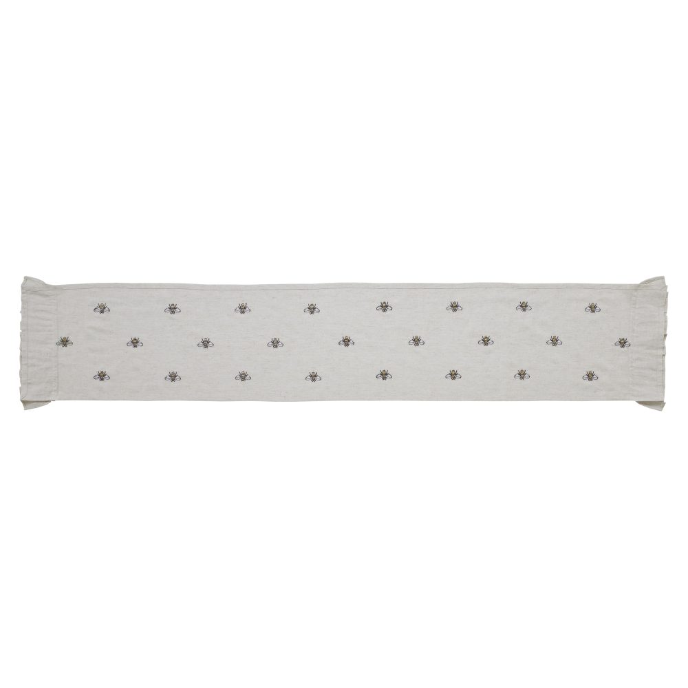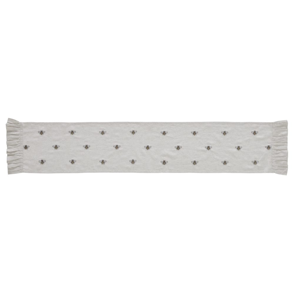 Create a joyful table for friends and family to gather round with a charming cottage-friendly design. The Embroidered Bee Runner includes one table runner measuring 13x72 inches. The rich texture and ruffled edging of the cotton-linen blend fabric is given a timeless feel with a natural creme color for soft, modern country vibes. Whimsical bees are embroidered across each runner for a cheerful look that will have guests buzzing. Complete your tabletop decor with other pieces from the Embroidered Bee Collection by VHC for modern farmhouse style.
