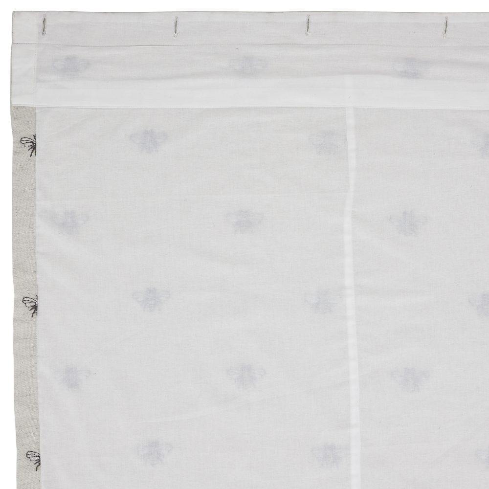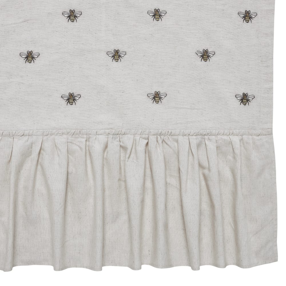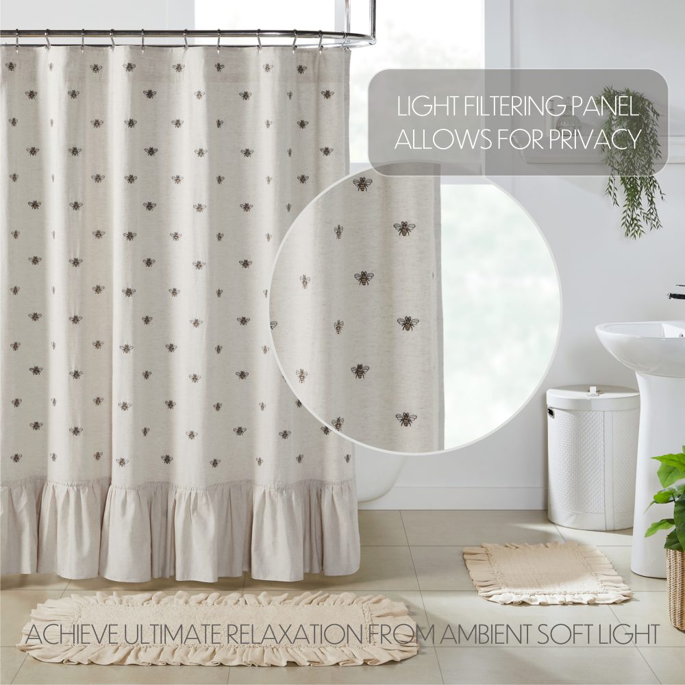 The Embroidered Bee Shower Curtain transforms your bath with whimsical, embroidered bee detailing. Features natural creme cotton flax with bee embroidery in soft yellow and charcoal gray. Measures 72 by 72 inches to fit standard sized showers and baths. Easily hang this classic country bath curtain with shower hooks of your choosing (not included) using the button holes attached. A 3" rod pocket is also available as an alternative hanging method.