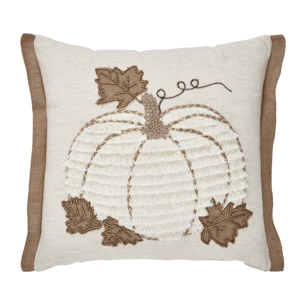 - PREMIUM FARMHOUSE DESIGN: Elevate your seasonal decor with the VHC Brands Embroidered Pumpkin Jute Flange Throw Pillow, a perfectly balanced 18×18-inch square accent piece meticulously crafted from a luxurious blend of soft cotton and rugged jute, creating a unique tactile symphony of textures; this decorative pillow showcases an intricately embroidered, generously fringed pumpkin with delicately outlined jute leaves and shimmering bead embellishments, all set against a serene farmhouse palette of soft white, sun-kissed light tan, and creamy light creme hues, delivering a warm, primitive, and cottage core charm that is ideal for your bed, entryway bench, or living room sofa and is easily maintained with spot cleaning.