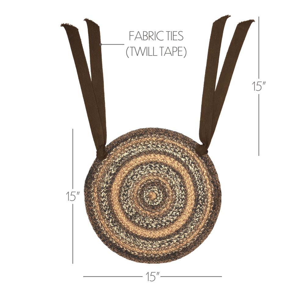 Add classic country style with jute in tightly woven braids of chestnut brown, country black and dark tan. The Espresso Jute Round Chair Pad is a durable 15-inch chair cushion with long brown ties to easily add a pop of modern farmhouse style and rustic charm to a wide variety of seating. This round seat pad features an 80 percent jute blend that lays flat easily for natural texture and style while offering your chair protection from damage. Spot clean and iron as needed. To give your kitchen or tabletop a complete natural brown look, pair with other items from the Espresso Collection including placemats, table runners and more for a traditional, rustic dining space.