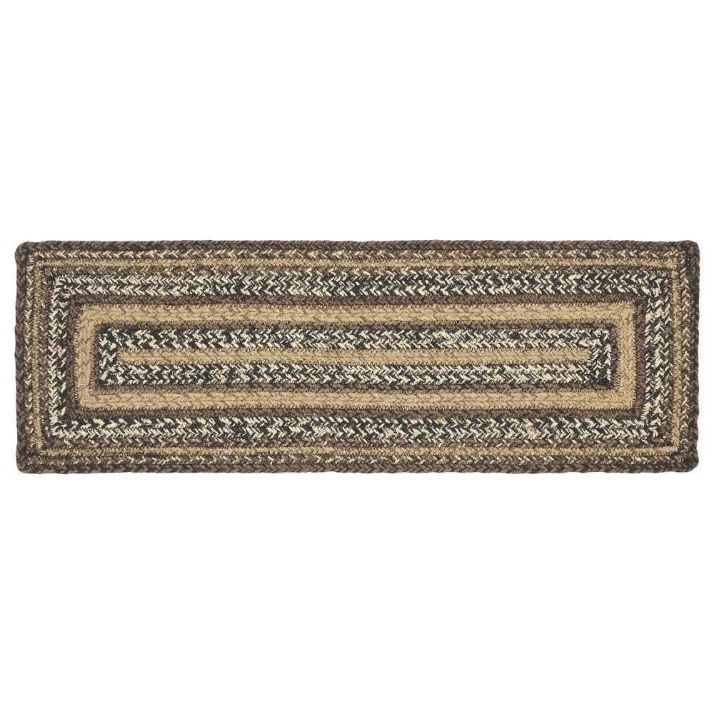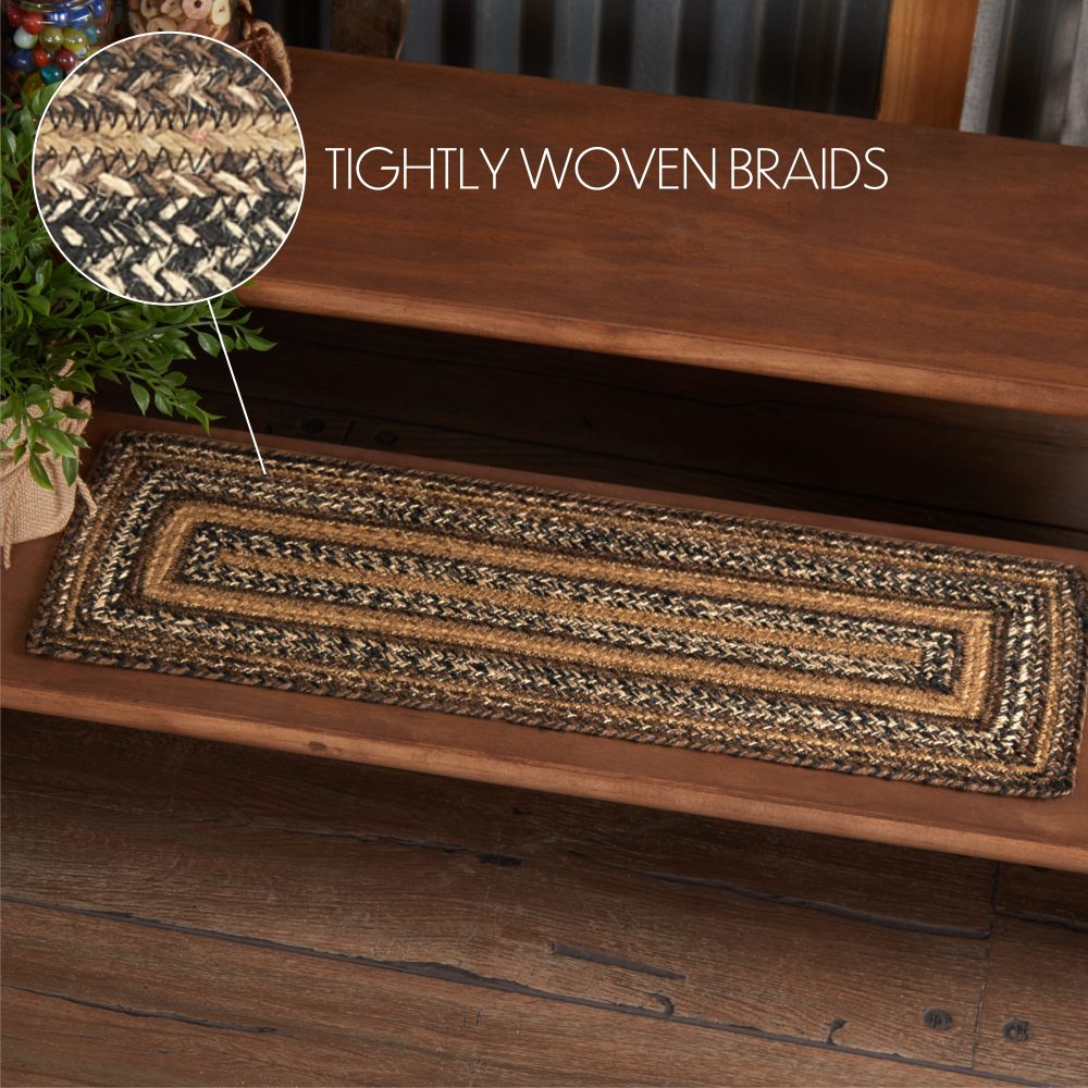 Protect stairways from damage and add style with braided jute in deep, earthy tones. The Espresso Jute Stair Tread Rectangle includes one 8.5x27 inch stair tread back by a latex spray to help prevent slipping. The low-profile jute features an innovative blend of 80 percent Jute and 20 percent cotton and other fibers to help the tread lay flat and resist creasing. This rectangle-shaped tread features a blend of chestnut brown, country black and dark tan braids for a warm, traditional country look. Coordinates with the Espresso Collection by VHC for a complete country cabin set featuring rugs, kitchen accessories and more.