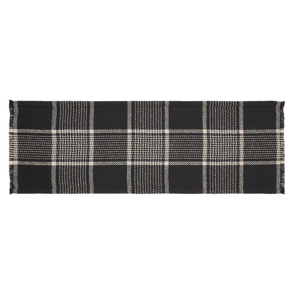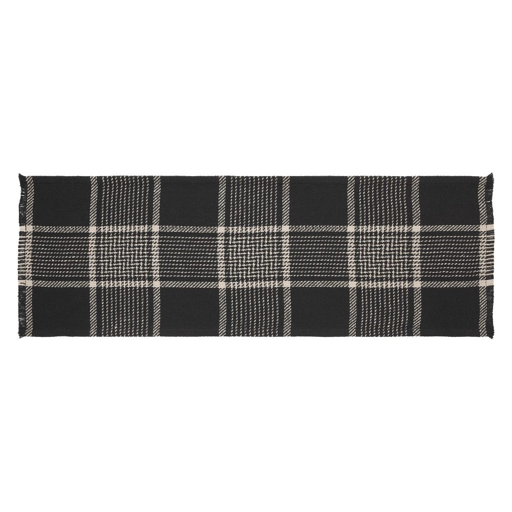 Give your tabletop decor a seasonal upgrade with traditional plaid in deep tones. The Eston Black Tan Runner measures 12 by 36 inches and features a woven base in recycled cotton with frayed edging. The dark fall table runner features a black base with deep tan striping. Pair with other pieces from the Eston Black Tan Plaid Collection by VHC for a timeless farmhouse look.