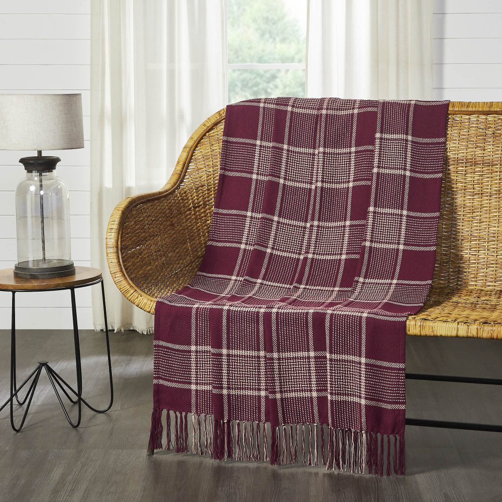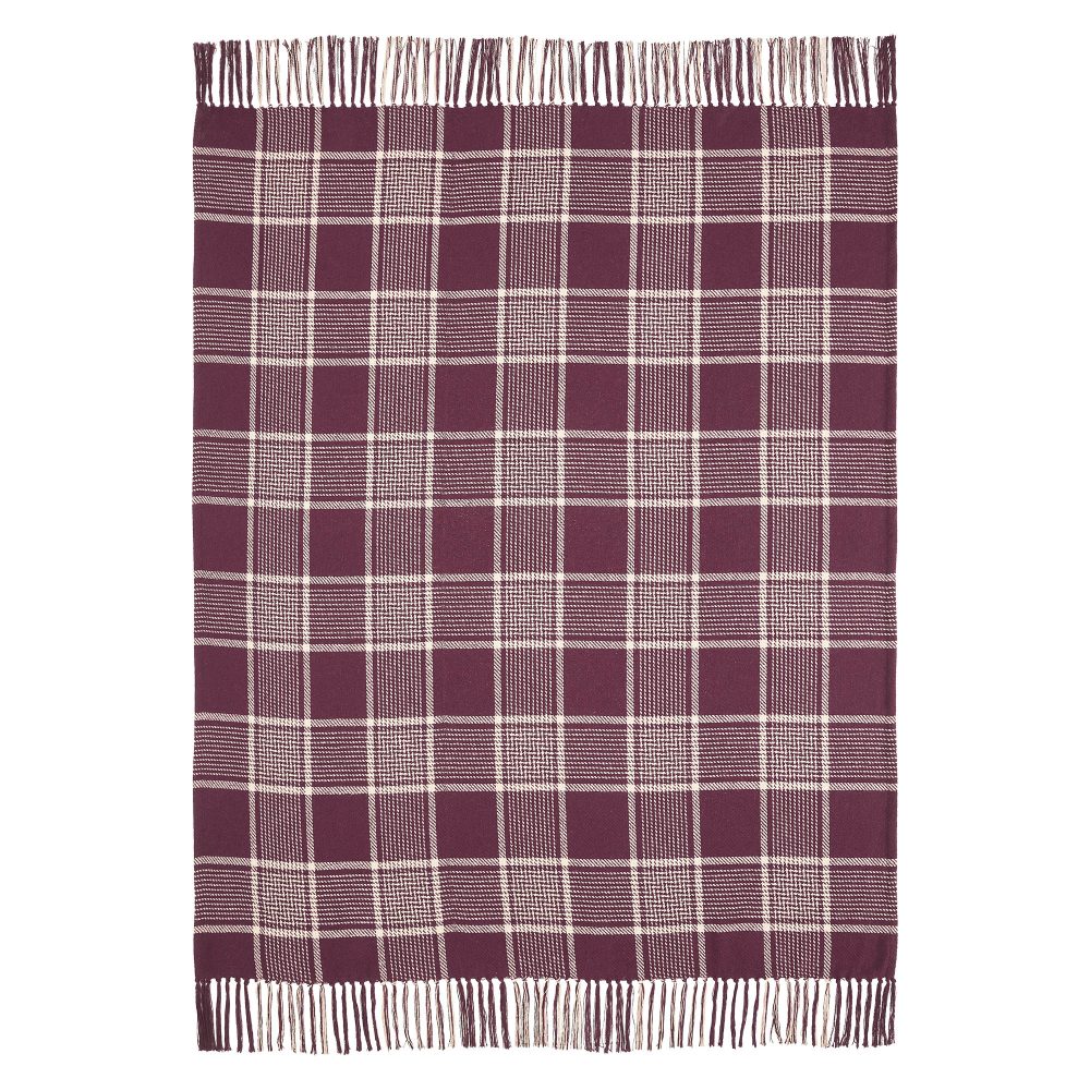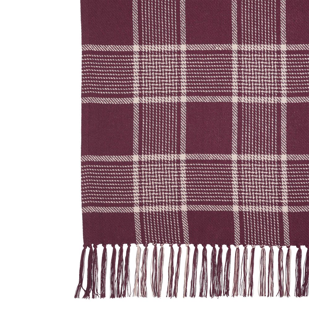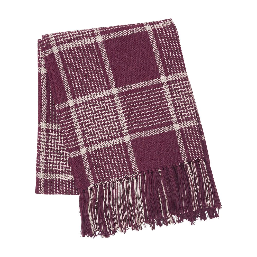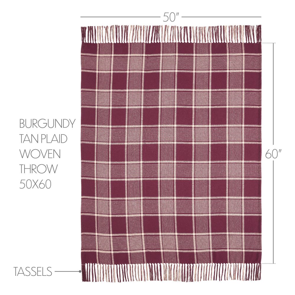 Deep burgundy and natural tan create a traditional tartan plaid for updated fall style. The Eston Burgundy Tan Plaid Throw measures 50x60 inches and features a deep red base with natural tan striping. Soft tassels add a finishing touch at each end of the throw blanket. Sling on the back of a chair or sofa for a perfect splash of autumn style. Machine washable and iron safe.