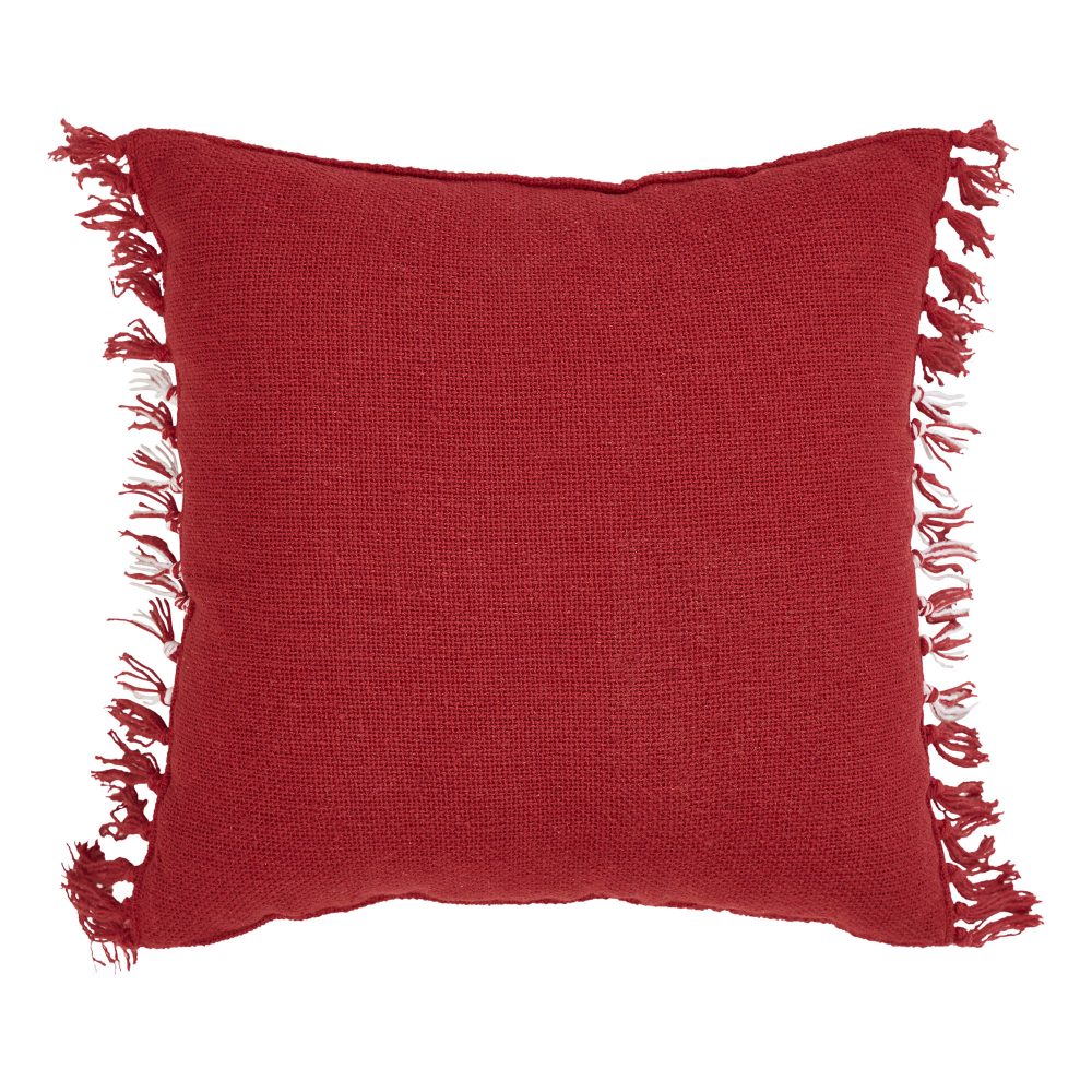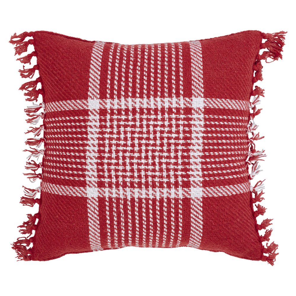 Add a little pop of sophisticated seasonal style with this Christmas accent pillow. The Eston Red White Plaid Pillow measures 12 by 12 inches. The filled pillow features a classic red base with crisp white striping for a simple plaid creating a charming farmhouse look with seasonal flair. A simple tasseled edge adds texture and interest. The cozy home accessory reverses to a simple red. Spot clean as needed. Coordinates with the Eston Red White Plaid Collection by VHC for modern farmhouse style for your whole home.
