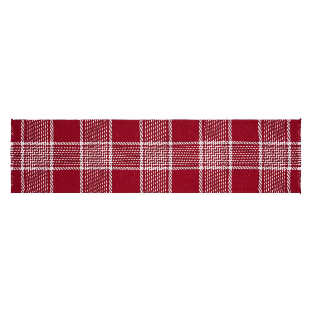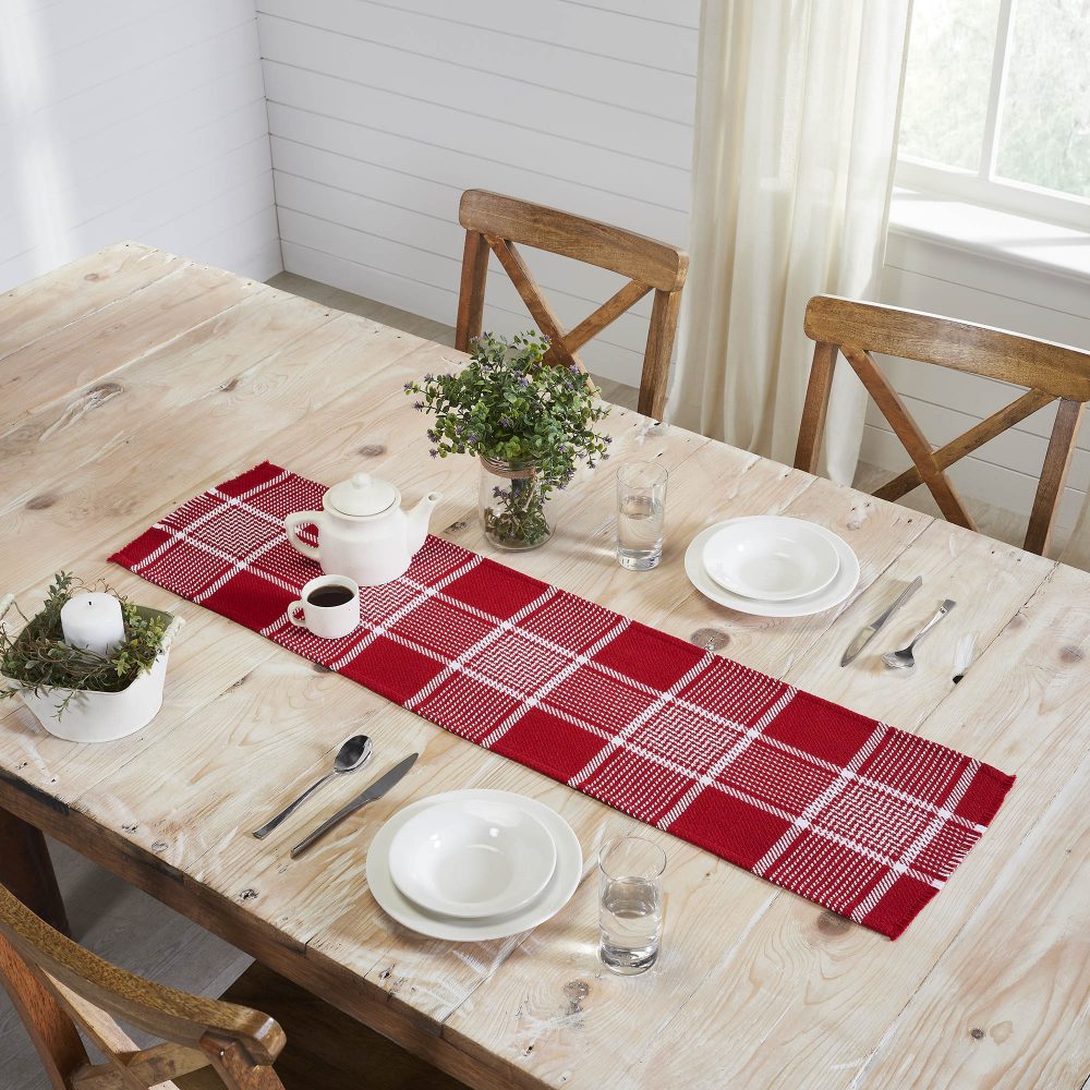 Create a warm and sophisticated table setting for family and friends to gather around this holiday season. The Eston Red White Plaid Table Runner measures 12x48 inches and is crafted in a durable cotton polyester blend with recycled materials. A classic red base with crisp white striping creates an elegant plaid design that expertly transitions your decor through Christmas and beyond. A soft fringed edge adds a rustic, farmhouse look. Coordinates with the Eston Red White Plaid Collection by VHC for modern farmhouse decor for the entire home.